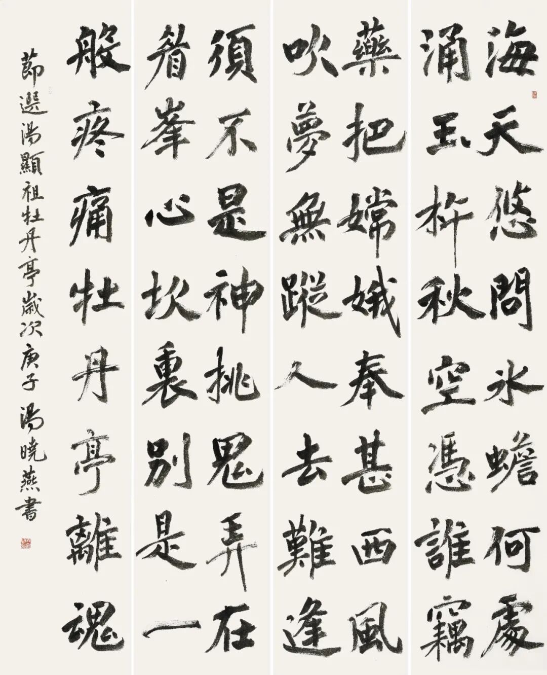 准确地说,汤晓燕虽“书龄”不长,但她的书法作品中那种用笔的提按转折、八面出锋,其婉转自如所表现出来的丰富才情,一般而言,只有身为一个有着细腻情感的女性书家,才能表现得出来,而且这也是作为一个书法家,将自己内心的情感与修养诉诸于笔端并得以充分表现的结果。