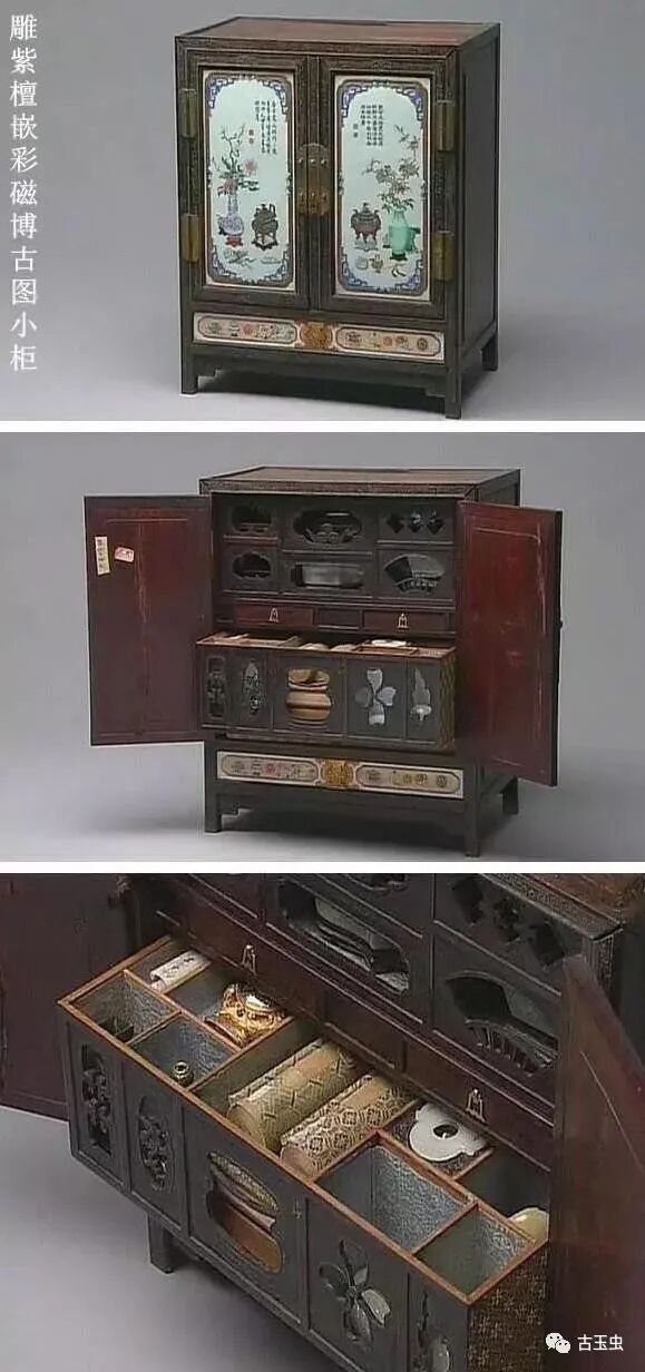 外盒以紫檀木雕高浮雕博古图为装饰,打开以紫檀木为屉,长边上有浅浮雕鹿、鹤图,左右两侧则浅雕开窗各种吉祥纹饰,将纹饰屉板拉开,则 布满各种古玩的小格,小格内皆有屉板可拉出,每件古玩都配有木座,可与屉板完全密合。从正上方也可看到,有珐瑯、日本漆器、鼻烟壶、鼻 烟盒、扇子,暗屉中书法、绘画等各式古玩,中间之屉可以取出,其中满布著各种材质之有趣古玩。