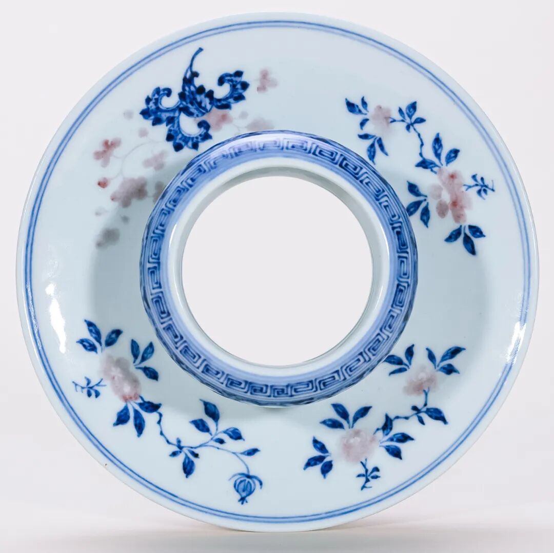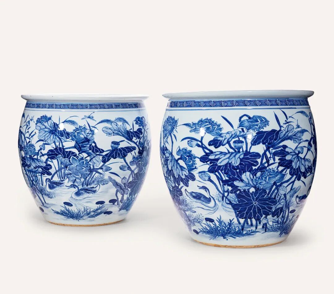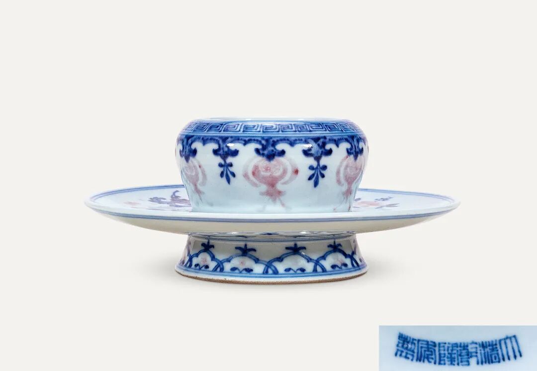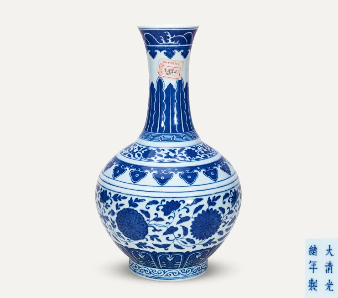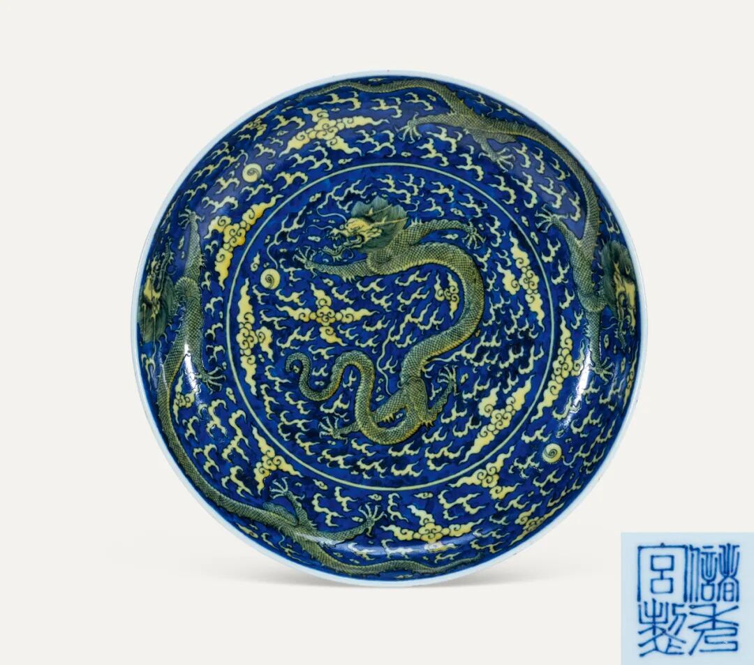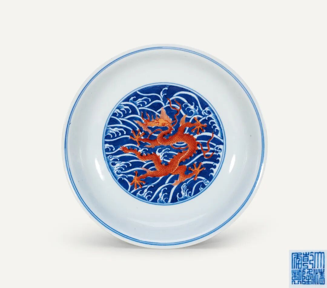 瓶身胎质坚密,通体以青花釉里红为饰,口微撇,口沿及肩部以釉里红饰锦地纹,间以青花绘花卉、云朵,颈部绘寒山水人物,画面中山峰起伏,峰峦层叠,江波浩渺,草木花滋,树丛郁茂,渔夫泛舟于江面,极富层次和空间感。瓶身绘岁寒三友,釉里红红绘松干,粗壮挺拔,靛青绘松轮朵朵,擎举如云。翠兰绘竹叶纤纤,挺拔修颀。墨蓝描梅枝,遒劲诘屈,梅开如红颜,笑绽枝头,风姿飒飒。布局疏密得当,画艺高超。青花釉里红发色纯正,显示出极为成熟的烧制工艺,实为不易。参阅:《玫茵堂藏中国陶瓷》第二卷,康蕊君着,1994年,页239,图1716 清乾隆 青花釉里红佛手纹盘,上海博物馆拍品形制仿宋代盏托,上呈敛口盂形,深腹,外延托盘唇口平敞,高足,足脊露胎细糯。中心上下通空,器形端庄雅致,施釉莹润,制作精湛,绘工精细。盏内壁施白釉,上口沿部青花绘回字纹,肩部垂如意云头纹,下以釉里红绘颗粒饱满的石榴,梅花、牡丹、石榴、茶花等四枚折枝花卉纹绘于托盘之上,反面亦绘折枝花卉纹。青花呈色靓丽,釉里红鲜润夺目,交相辉映,实属同类器中上佳之作。参阅:《故宫博物院藏文物珍品大系——杂釉彩·素三彩》,上海科学技术出版社、商务印书(香港)有限公司,2009年,第190页,图盘敞口,弧壁,圈足,底心落「大清道光年制」篆书款识。通体施青润白釉,以青花矾红装饰纹样,盘心绘五爪神龙腾跃于海水波涛之上,外壁绘海水九龙纹,所绘苍龙头部窄平,双眼横排,龙须向上飞扬,五爪呈风车状,身躯遒劲,盘卷有力,鳞鬃毕现,表现出生动威武的气势。九龙有龙生九子之意,“九”历来是中国传统文化中代表最高权威的“天数”,“九龙在天”代表帝王至高无上的权力。荷塘鸳鸯是明清瓷器的经典题材,古人视鸳鸯为爱情的象征,《古今注》说鸳鸯为“鸟类,雌雄未尝相离,人得其一,则一必思而死,故曰匹鸟”。瓷器装饰中的鸳鸯皆成双成对,且多与莲池相配,故亦称“鸳鸯戏莲”,因寓意美好、图案喜闻乐见而为世人喜爱。此对缸造型沉稳大气,折沿,鼓腹,外壁通景绘荷塘鸳鸯图,荷花富丽华贵,鸳鸯悠然漫步觅食,画面运用写实的手法,将荷花、荷叶、莲蓬、花茎描绘得惟妙惟肖,呈现出一派夏日荷塘的淡雅景致。层次分明,将荷叶的阴阳向背,荷花的花荣花谢表现得十分准确,尤其是以大片平涂描绘荷叶,虚实向背无不自然生动,青花发色沈稳而不失艳丽,多层分水画工精细,线条流畅自然,增幅画面富有生动感。整体画面饱满,构图巧妙,栩栩如生,显示出一派生机勃勃的景象。宋代周敦颐的名篇《爱莲说》中“出淤泥而不染,濯清涟而不妖”,这一赞美荷花高洁品格寓意的名句,使后世文人倍加推崇荷花。此外,莲蓬又有「多子多福」的寓意,是颇具吉祥喜庆色彩的图案。参阅:《故宫博物院藏文物珍品大系—杂釉彩·素三彩》,上海科学技术出版社,2009年,页190,图150此盘敞口,弧壁,圈足。盘心绘海水龙纹,海水线条细密,多呈涡状,一条五爪祥龙恣肆于海浪之上。盘外壁亦绘青花海水,其上饰矾红彩游龙九条,姿态各异,极具动感,且壁外红龙姿态各异,腾跃于海浪之中。青花发色浓艳,红彩凝腻鲜亮,强烈的对比使得龙纹更显生动大气。圈足内以青花书「大清乾隆年制」六字三行篆书款,款识规整。参阅:《故宫博物院藏文物珍品大系—青花釉里红(下)》,耿宝昌主编,上海科学技术出版社、商务印书馆(香港),2000年,第174页,图159 清光绪 青花缠枝莲纹赏瓶,故宫博物院此赏瓶侈口,长束颈,溜肩,肩饰凸弦纹,圆弧腹,下承圈足。外壁以青花装饰,绘九层纹饰,自上而下分别是海水纹,下饰如意云头纹,蕉叶纹绕颈一周,方回纹,下绘缠枝花卉纹于肩部,下为如意云头纹,腹部满饰缠枝莲纹,胫部饰莲瓣纹,卷草纹饰圈足,青花发色浓艳。外底心以青花书「大清光绪年制」楷书款。黄地青花因黄色寓意高贵堂皇,黄蓝两色又相映成趣,自创烧之始即为宫廷所重,并一直延续烧制至明末。有清一代,康雍乾三帝皆有慕古之心,尤其是乾隆皇帝更于摹古方面建树颇丰。黄地青花作为宣窑之代表作,自然颇受珍视,多有烧造。外壁通体以青花为饰,自口沿起分层饰如意云头、折枝花卉、莲瓣纹等。主题纹饰构图饱满,花朵形态各异,排列有序却不失灵动,枝蔓翻卷,婀娜多姿。纹饰风格具典型乾隆瓷器特质,装饰性极强,全器釉质温润肥厚,青花鲜艳翠亮,发色沉稳,画工一气呵成,风格华美典雅,为典型乾隆陈设大器。葫芦藤蔓绵延,“累然而生,食之无穷”,因葫芦多籽,籽粒众多,数而难尽,为绵延后代,子孙众多的象征,而有多子多孙、江山永固的吉祥寓意,为吉祥之物,又为佛家“暗八仙”之一。此器呈葫芦状,因其谐音“福禄”、又形似"吉"字,故有大吉瓶之美誉,本品器型端庄挺拔,胎釉俱佳,主题纹饰为云龙纹,威龙穿梭于祥云、火珠之间,神态生动,气势磅礴,显得威严庄重。飞龙形态各异,或正面威严,或腾空而起,气度非凡,威武生动,虽无款但体现了飞龙在天的皇家威仪,整器布局疏密有致,繁而不乱,纹饰层次丰富,青花发色妍丽,釉色纯净幽雅,纹饰线条遒劲流畅,皇家气派十足。整器因似一只覆置的摇铃而得名,又因造型类似古代双陆棋,也称双陆尊,系康熙朝创设的一种用于插花的陈设器。此器以粉彩加堆塑装饰,苍龙气韵滂沱,俯首下探,一尾鲤鱼跃然而出,与苍龙形成相对之势,整体描绘详尽而写实。龙角、鼻、颌下生髯,背脊、龙爪及龙尾等具体写实,