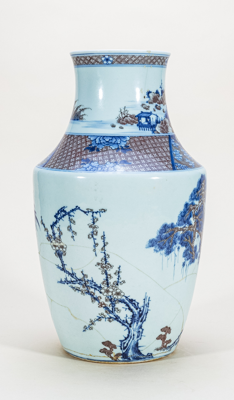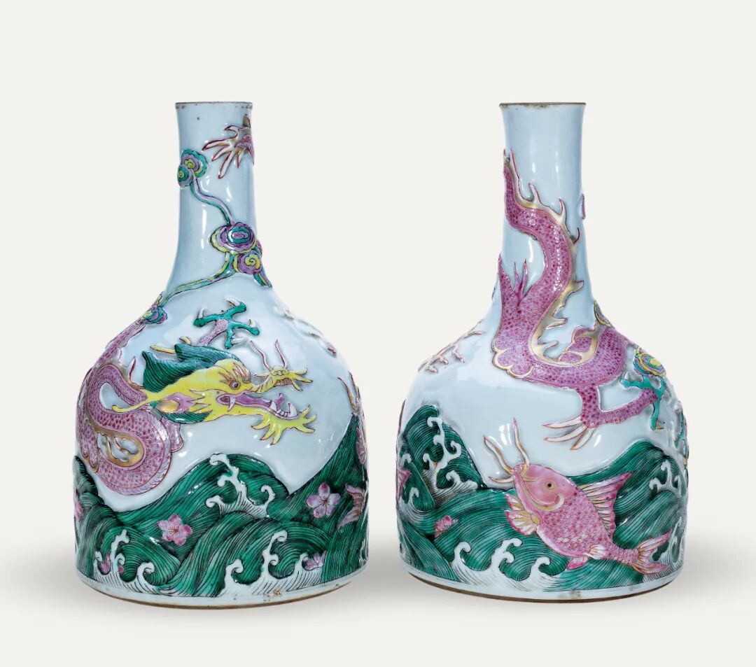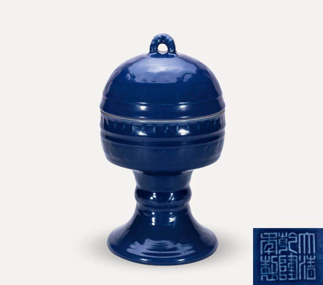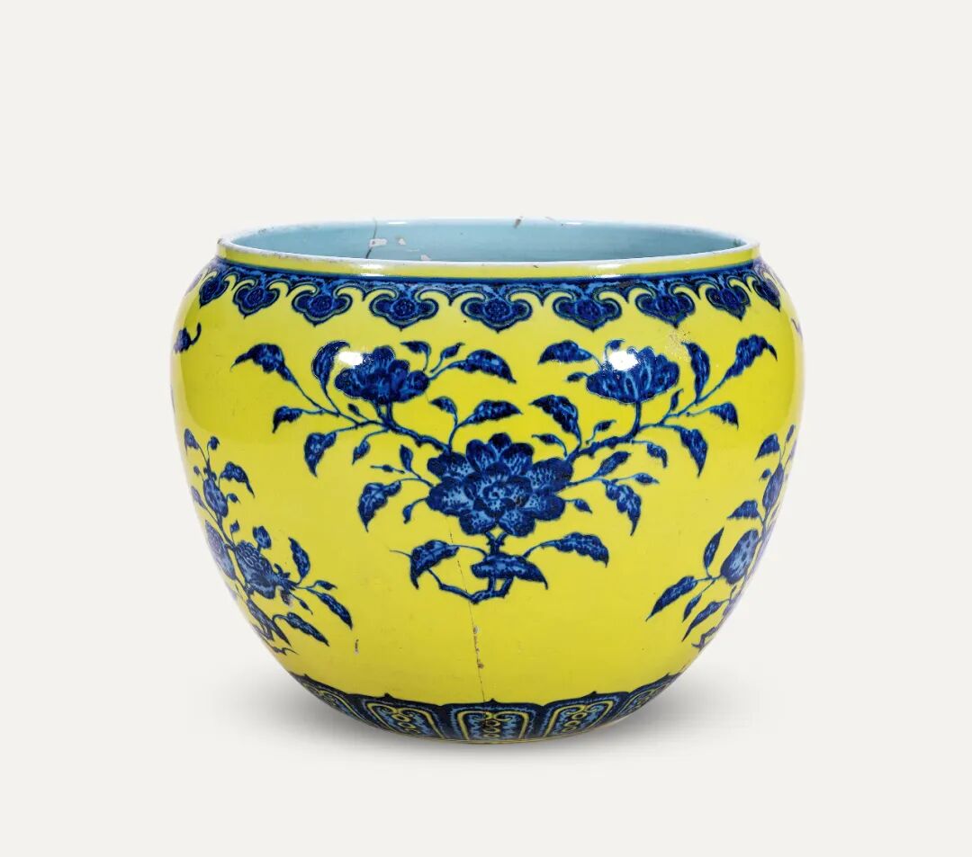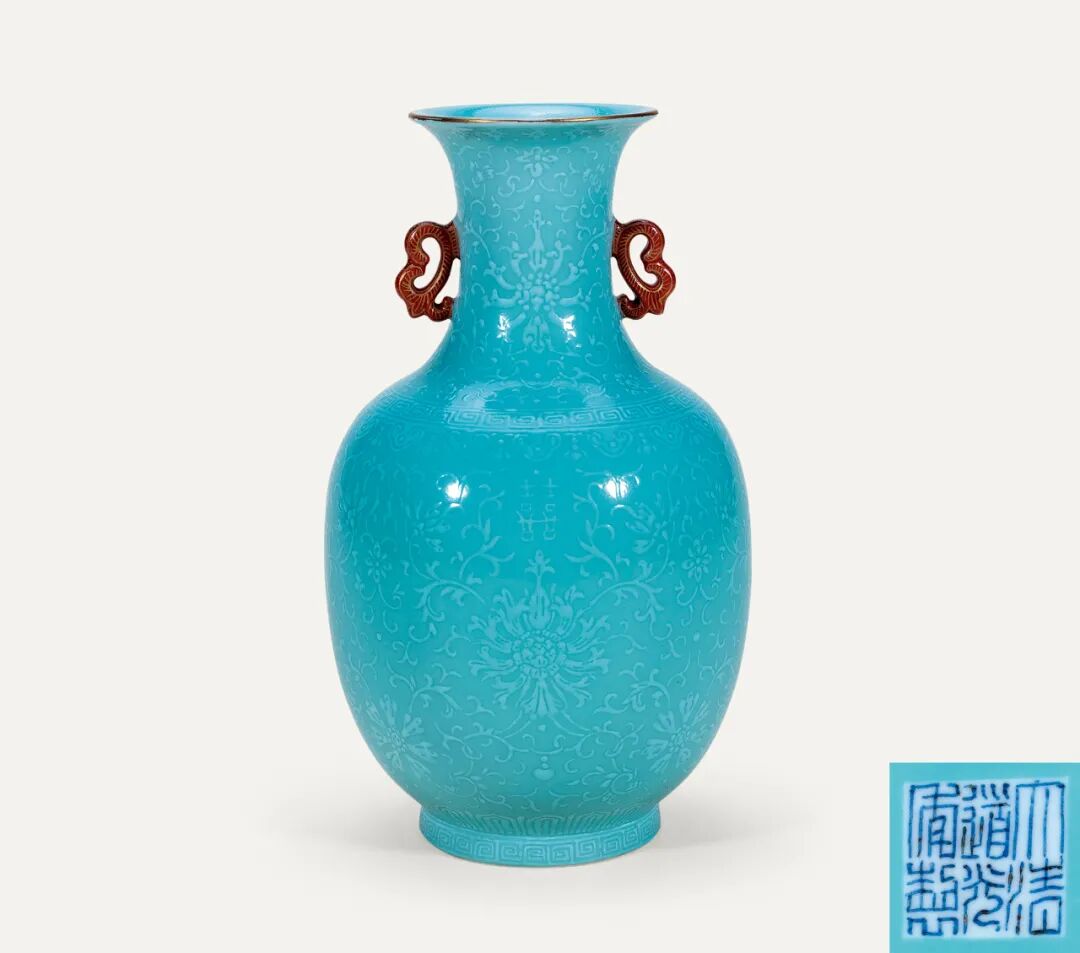 瓶身胎质坚密,通体以青花釉里红为饰,口微撇,口沿及肩部以釉里红饰锦地纹,间以青花绘花卉、云朵,颈部绘寒山水人物,画面中山峰起伏,峰峦层叠,江波浩渺,草木花滋,树丛郁茂,渔夫泛舟于江面,极富层次和空间感。瓶身绘岁寒三友,釉里红红绘松干,粗壮挺拔,靛青绘松轮朵朵,擎举如云。翠兰绘竹叶纤纤,挺拔修颀。墨蓝描梅枝,遒劲诘屈,梅开如红颜,笑绽枝头,风姿飒飒。布局疏密得当,画艺高超。青花釉里红发色纯正,显示出极为成熟的烧制工艺,实为不易。参阅:《玫茵堂藏中国陶瓷》第二卷,康蕊君着,1994年,页239,图1716 清乾隆 青花釉里红佛手纹盘,上海博物馆拍品形制仿宋代盏托,上呈敛口盂形,深腹,外延托盘唇口平敞,高足,足脊露胎细糯。中心上下通空,器形端庄雅致,施釉莹润,制作精湛,绘工精细。盏内壁施白釉,上口沿部青花绘回字纹,肩部垂如意云头纹,下以釉里红绘颗粒饱满的石榴,梅花、牡丹、石榴、茶花等四枚折枝花卉纹绘于托盘之上,反面亦绘折枝花卉纹。青花呈色靓丽,釉里红鲜润夺目,交相辉映,实属同类器中上佳之作。参阅:《故宫博物院藏文物珍品大系——杂釉彩·素三彩》,上海科学技术出版社、商务印书(香港)有限公司,2009年,第190页,图盘敞口,弧壁,圈足,底心落「大清道光年制」篆书款识。通体施青润白釉,以青花矾红装饰纹样,盘心绘五爪神龙腾跃于海水波涛之上,外壁绘海水九龙纹,所绘苍龙头部窄平,双眼横排,龙须向上飞扬,五爪呈风车状,身躯遒劲,盘卷有力,鳞鬃毕现,表现出生动威武的气势。九龙有龙生九子之意,“九”历来是中国传统文化中代表最高权威的“天数”,“九龙在天”代表帝王至高无上的权力。荷塘鸳鸯是明清瓷器的经典题材,古人视鸳鸯为爱情的象征,《古今注》说鸳鸯为“鸟类,雌雄未尝相离,人得其一,则一必思而死,故曰匹鸟”。瓷器装饰中的鸳鸯皆成双成对,且多与莲池相配,故亦称“鸳鸯戏莲”,因寓意美好、图案喜闻乐见而为世人喜爱。此对缸造型沉稳大气,折沿,鼓腹,外壁通景绘荷塘鸳鸯图,荷花富丽华贵,鸳鸯悠然漫步觅食,画面运用写实的手法,将荷花、荷叶、莲蓬、花茎描绘得惟妙惟肖,呈现出一派夏日荷塘的淡雅景致。层次分明,将荷叶的阴阳向背,荷花的花荣花谢表现得十分准确,尤其是以大片平涂描绘荷叶,虚实向背无不自然生动,青花发色沈稳而不失艳丽,多层分水画工精细,线条流畅自然,增幅画面富有生动感。整体画面饱满,构图巧妙,栩栩如生,显示出一派生机勃勃的景象。宋代周敦颐的名篇《爱莲说》中“出淤泥而不染,濯清涟而不妖”,这一赞美荷花高洁品格寓意的名句,使后世文人倍加推崇荷花。此外,莲蓬又有「多子多福」的寓意,是颇具吉祥喜庆色彩的图案。参阅:《故宫博物院藏文物珍品大系—杂釉彩·素三彩》,上海科学技术出版社,2009年,页190,图150此盘敞口,弧壁,圈足。盘心绘海水龙纹,海水线条细密,多呈涡状,一条五爪祥龙恣肆于海浪之上。盘外壁亦绘青花海水,其上饰矾红彩游龙九条,姿态各异,极具动感,且壁外红龙姿态各异,腾跃于海浪之中。青花发色浓艳,红彩凝腻鲜亮,强烈的对比使得龙纹更显生动大气。圈足内以青花书「大清乾隆年制」六字三行篆书款,款识规整。参阅:《故宫博物院藏文物珍品大系—青花釉里红(下)》,耿宝昌主编,上海科学技术出版社、商务印书馆(香港),2000年,第174页,图159 清光绪 青花缠枝莲纹赏瓶,故宫博物院此赏瓶侈口,长束颈,溜肩,肩饰凸弦纹,圆弧腹,下承圈足。外壁以青花装饰,绘九层纹饰,自上而下分别是海水纹,下饰如意云头纹,蕉叶纹绕颈一周,方回纹,下绘缠枝花卉纹于肩部,下为如意云头纹,腹部满饰缠枝莲纹,胫部饰莲瓣纹,卷草纹饰圈足,青花发色浓艳。外底心以青花书「大清光绪年制」楷书款。黄地青花因黄色寓意高贵堂皇,黄蓝两色又相映成趣,自创烧之始即为宫廷所重,并一直延续烧制至明末。有清一代,康雍乾三帝皆有慕古之心,尤其是乾隆皇帝更于摹古方面建树颇丰。黄地青花作为宣窑之代表作,自然颇受珍视,多有烧造。外壁通体以青花为饰,自口沿起分层饰如意云头、折枝花卉、莲瓣纹等。主题纹饰构图饱满,花朵形态各异,排列有序却不失灵动,枝蔓翻卷,婀娜多姿。纹饰风格具典型乾隆瓷器特质,装饰性极强,全器釉质温润肥厚,青花鲜艳翠亮,发色沉稳,画工一气呵成,风格华美典雅,为典型乾隆陈设大器。葫芦藤蔓绵延,“累然而生,食之无穷”,因葫芦多籽,籽粒众多,数而难尽,为绵延后代,子孙众多的象征,而有多子多孙、江山永固的吉祥寓意,为吉祥之物,又为佛家“暗八仙”之一。此器呈葫芦状,因其谐音“福禄”、又形似"吉"字,故有大吉瓶之美誉,本品器型端庄挺拔,胎釉俱佳,主题纹饰为云龙纹,威龙穿梭于祥云、火珠之间,神态生动,气势磅礴,显得威严庄重。飞龙形态各异,或正面威严,或腾空而起,气度非凡,威武生动,虽无款但体现了飞龙在天的皇家威仪,整器布局疏密有致,繁而不乱,纹饰层次丰富,青花发色妍丽,釉色纯净幽雅,纹饰线条遒劲流畅,皇家气派十足。整器因似一只覆置的摇铃而得名,又因造型类似古代双陆棋,也称双陆尊,系康熙朝创设的一种用于插花的陈设器。此器以粉彩加堆塑装饰,苍龙气韵滂沱,俯首下探,一尾鲤鱼跃然而出,与苍龙形成相对之势,整体描绘详尽而写实。龙角、鼻、颌下生髯,背脊、龙爪及龙尾等具体写实,