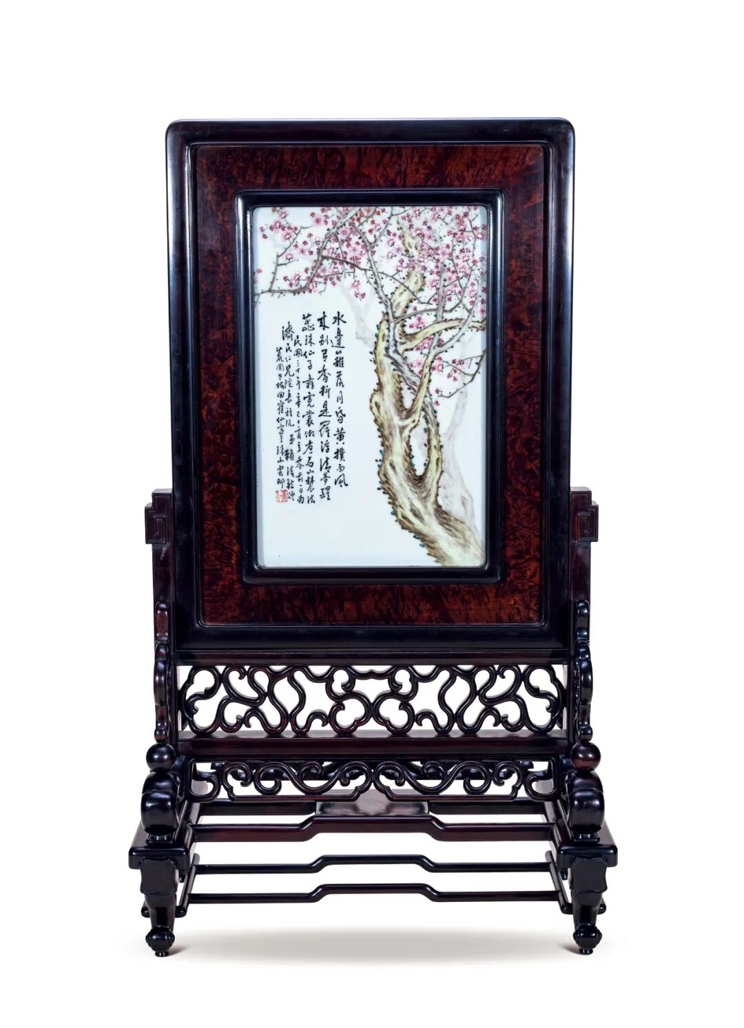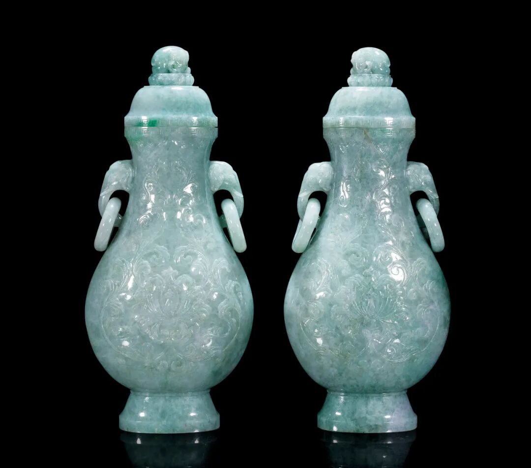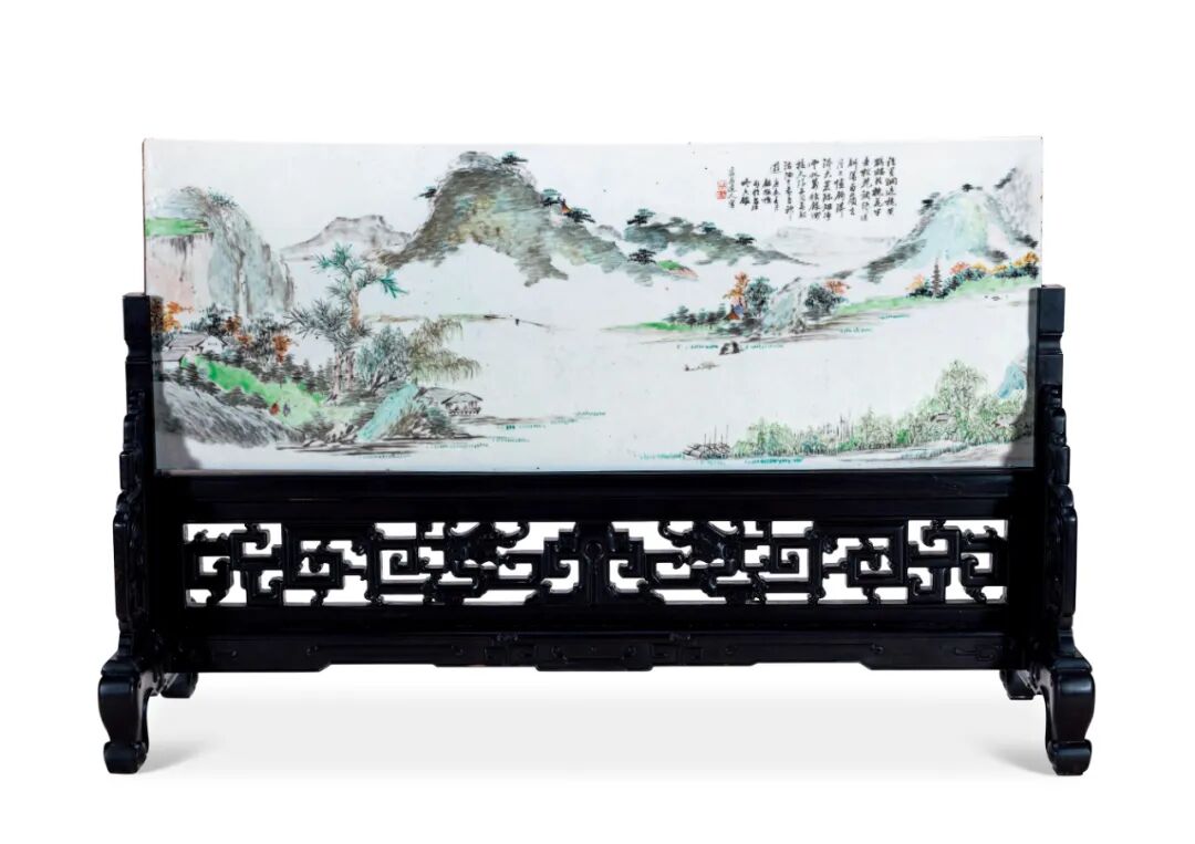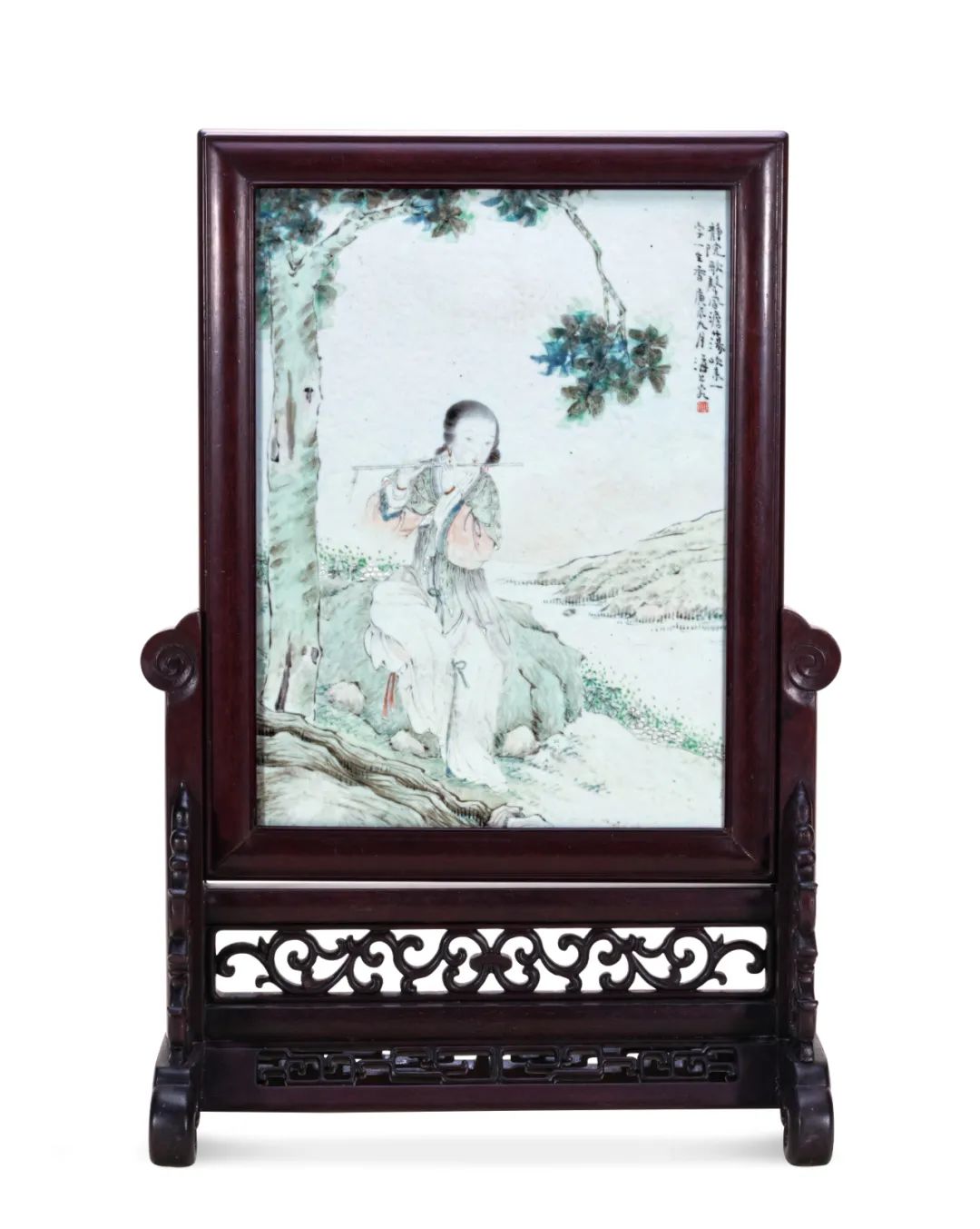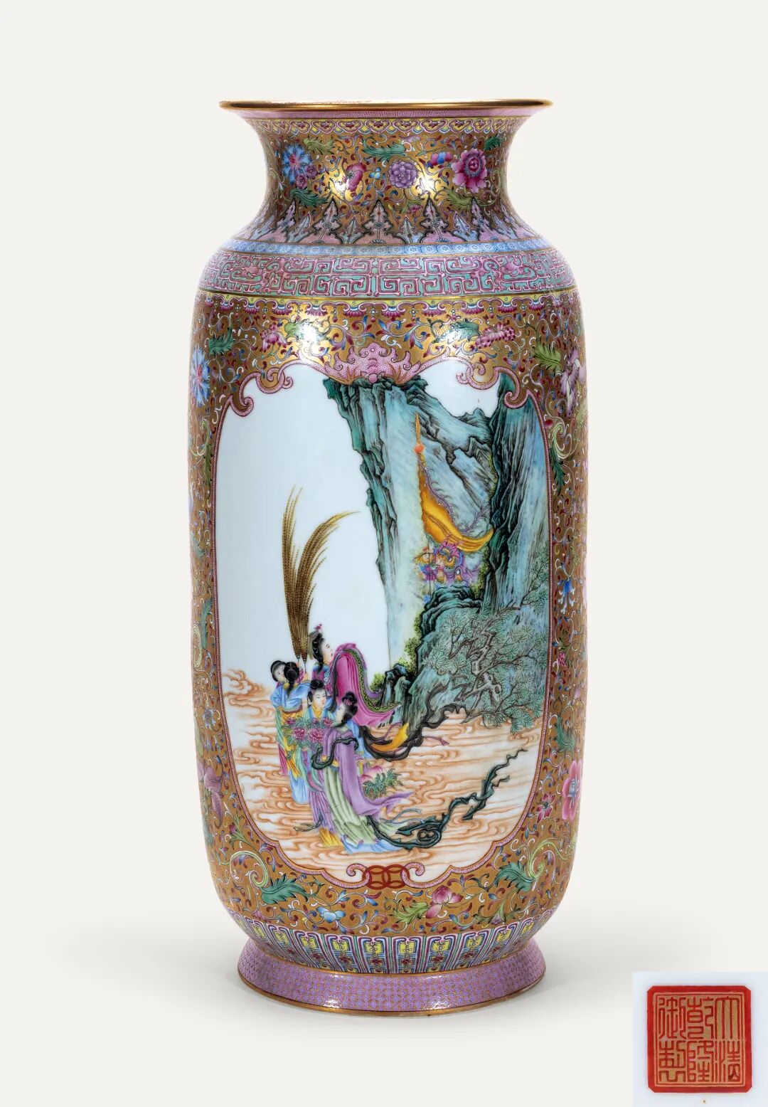 翡翠是一种最珍贵、价值最高的玉石,被称为“玉石之冠”。还由于深受东方一些国家和地区人们的喜爱,因而被国际珠宝界称为“东方之宝”。此器体量硕大,以大块翡翠雕琢而成,质地精良,远观宝光莹莹,近触细腻莹洁。盖瓶扁圆形,瑞兽钮覆盅式盖,子母口。瓶身束颈溜肩,弧腹,高圈足略外撇。整体造型修长典雅。瓶颈左右两侧雕作象首衔环式样,鼻圈绕圆形活环为耳。瓶身刻宝相花卉纹,工艺精到,构图饱满和谐。整器画面动中有静,静中有动,于精美之处彰显逸趣。整器雕刻刀法细腻、精准,刻画流畅、生动,选材上佳,殊为难得。尺寸:长 33cm,宽 21.5cm,高 15cm参阅:《螽斯衍庆》(总本)清乾隆年南府朱墨抄本,故宫博物院藏《螽斯衍庆》是清代宫廷庆典承应戏中“皇太后万寿圣诞承应”、“皇帝万寿圣诞承应”、“皇后千秋承应”和“皇帝大婚礼成承应”剧目之一。清乾隆皇帝六旬大庆、同治和光绪二帝大婚都曾承应此剧。本剧演的是天下和平,圣主仁恩施于内外。九天圣母召保护麟趾婴儿的送圣郎君同往神州,呈献螽斯麟趾之祥,以兆六宫子孙繁衍兴旺。又有天福和天寿二星君同行,敬襄盛事。御筵前,九天圣母献《多子图》。戏中,九天圣母慈慧温柔,含宏广大,酝生生不息之机,护佑皇宫,化育群生,护持孩稚。此剧用“螽斯”之名寓意后妃之间和睦相处,皇室子孙众多。此紫檀螽斯衍庆锦地纹书箱应为宫廷盛装《螽斯衍庆》的专用书箱,此盒整体呈长方形,材质为紫檀,上面锦地纹,中心书“螽斯衍庆”四字。盒分为上下两层。盒边侧雕竹编纹,雕琢细腻,线条刚劲饱满,此品做工费时费工,匠心独运。乾隆工艺明显,具有极高的艺术及收藏价值。来源:纽约佳士得,2013年春拍,Lot 1561拍品敞口倭角,弧腹,圈足。腹内壁施松石绿釉,外壁以金彩为地绘麻姑献寿图,人物纤毫毕现,印证了“嘉庆所绘人物亦有极精者”的记载。仕女造型与同时代画家改琦、王素类似。东晋时期由葛洪著作的文献《神仙传》中讲述麻姑是一位勤劳善良又美丽的南城人,因积累了不少功德,后而得道成仙,成为下八洞神仙之一的女寿仙,非常适宜作为给女性祝寿的礼品,高贵典雅,赏心悦目。相同制式里湖南省博物馆藏有同等纹饰、样式盖碗,不过尺寸较小,款识为「大清道光年制」。作者简介:叶震嘉,生卒年不详,别名叶振嘉,陶瓷美术家。1956年在景德镇陶瓷美术生产合作社供职,1958年在景德镇艺术瓷厂供职,1959年由景德镇市人民政府授予“陶瓷美术家”称号。擅长粉彩人物,其作品布局简约、主题突出,色彩明快鲜艳、衣纹线条流畅,立体感极强,显得功底深厚。作品撇口,短颈,丰肩,直腹,口沿金边,饰回纹、如意纹,肩部饰蕉叶纹、夔龙纹,底部饰莲瓣纹。通体以金彩万花为地,富丽而又清雅;以蝙蝠、如意、钱币纹做边框,两面开光内绘珐琅彩人物故事。一面绘大富贵亦寿考,作品以唐代名将郭子仪遇仙的古典故事为题材,作品绘云中仙女,立于祥云之上,目视郭子仪,旁边站侍女,人物形态生动,衣纹采用没骨画法,笔法细腻,青松峻石,勾描有致,珐琅敷染讲究冷暖变化,清丽高华。一面绘福禄寿喜,寓意“百子百福”、“高官厚禄”、“延年益寿”、“欢天喜地”,画面绘四星相聚崖前苍松之下,人物造型优美,形态兼备,没骨法画衣纹,设色妍丽,处处可见匠心。富贵寿考、福禄寿喜是常用题材,爱好收藏的达官贵人日思夜想高官显爵、子孙满堂、延年益寿,契合中国人的美好愿望。本品八屏成堂,红木攒框,每屏镶嵌浅绛山水人物瓷板七件,人物描绘细腻传神,运笔简练,花鸟灵动富有情趣,山水笔法老辣大方,浅绛色彩纯正,彩料浓淡分布恰到好处。五十六片精彩瓷板汇聚一堂,为厅堂陈设审美收藏不可多得之物。题识:谁买洞庭秋,黄鹤楼头,槐花半老桂花稠。才送斜阳西岭去,月上镰钩。漭漭大荒流,烟净云收,万条银线接天浮。不用画船沽酒去,我自神游。庚辰(1880)春月录板桥句于昌江吟香馆。宕愚道人写(愚、道人)著录:《浅绛瓷笺》陈树群、俞吉伟,崇文书局,2022,P320、21本块瓷板是国内目前发现的同时代尺寸最大的浅绛瓷板。整块横版作者以洞庭秋月为题,裁八百里洞庭一角,全图用笔淡雅,远山或浓或淡,都以干枯的笔勾皴,疏朗简秀,清爽潇洒。山间丛林茂密,点缀村舍,茅亭,水中则有渔舟垂钓。整个画面林峦浑秀,草木华滋,充满了隐者悠游林泉,萧散淡泊的诗意,散发出浓郁的文人气息。作者将诗、书、画融为一体,不重形似,笔法简练精到,山和水布置疏密得当,层次分明,但觉江水茫茫,天水一色,令人心旷神怡。本拍品的整体构图与黄公望被誉为“山水第一神品”的《富春山居图》有异曲同工之妙,可见作者对黄公望演习颇深,深的其浅绛山水之妙,虽作者愚道人无法考证其人生际遇,但有如此恢宏作品存世,也是其人生浓墨重彩的一笔。题识:试鼓丘中琴,便看幽人出。小松程崇楷写。(崇楷)碧梧清暑 己卯(1879年)首夏雪笠程门写(程、门)虞阶漕帅大人钧鉴著录:《浅绛彩瓷品鉴》,刘杨,江西教育出版社,P30说明:上款人苏凤文,清贵州贵筑(今贵阳)人,字虞阶。道光举人。同治元年(1862)以广西左江道迁按察使。四年迁布政使。六年授广西巡抚。十年擢漕运总督,旋因病解职。同年程门作山水瓷板题款“路穿松坞翠阴斜 己卯首夏,虞阶漕帅大人钧鉴,雪笠程门写”景德镇博物馆藏。(见于陈树群《烟云寄兴—程门大事