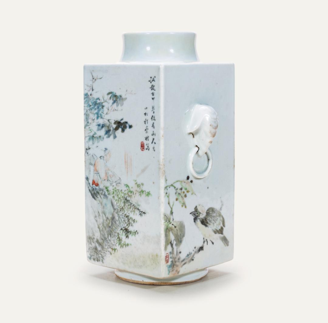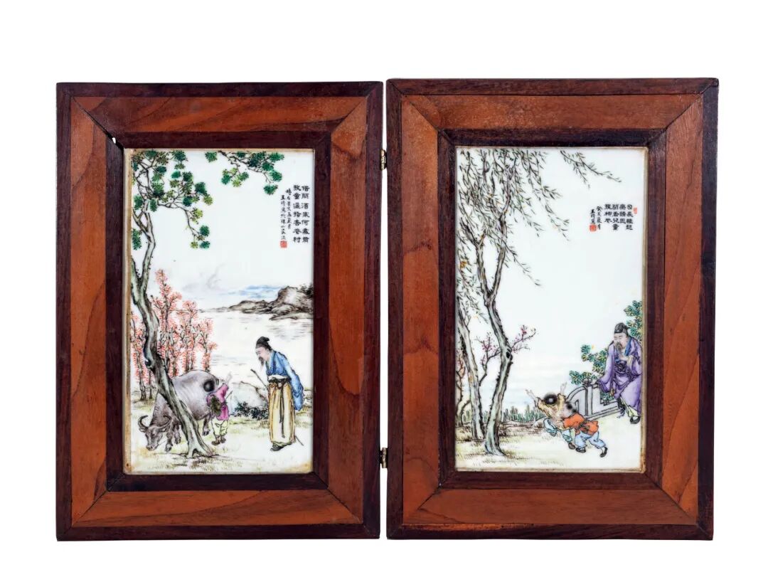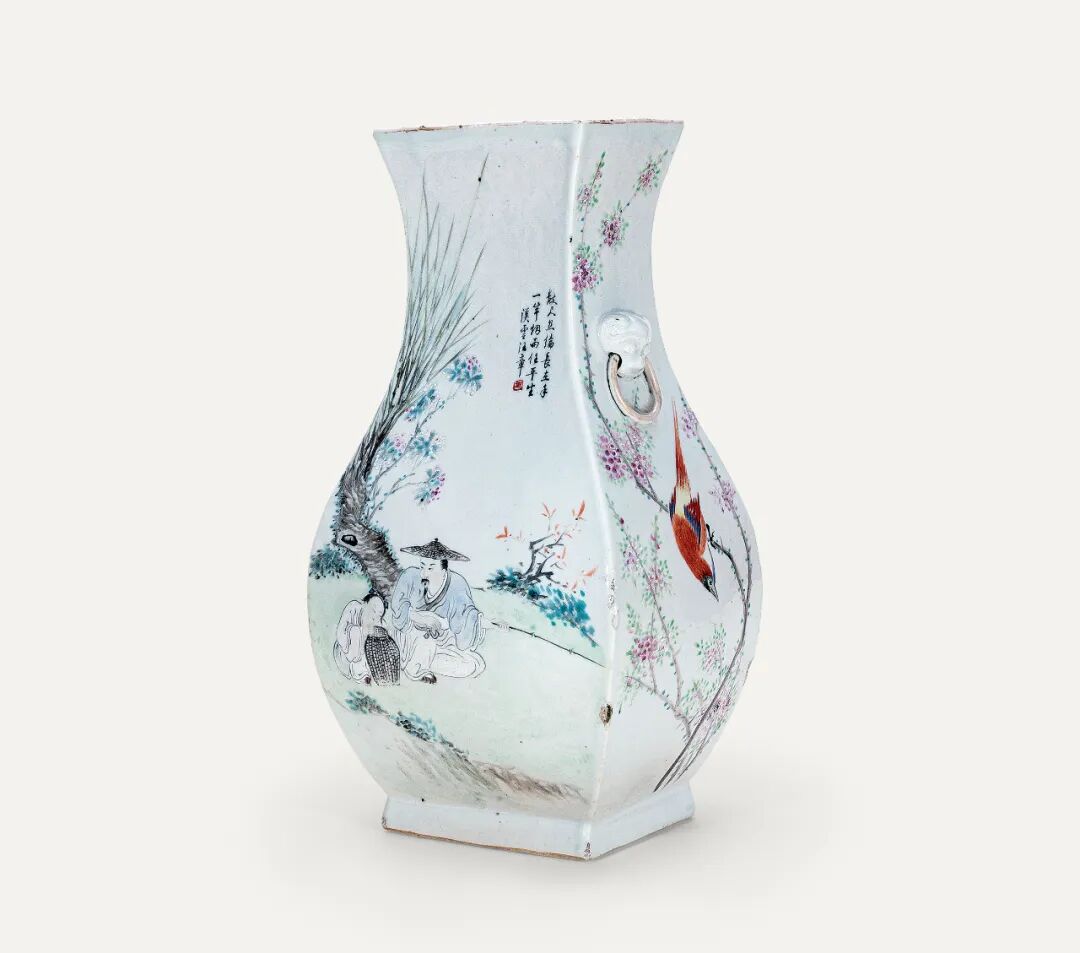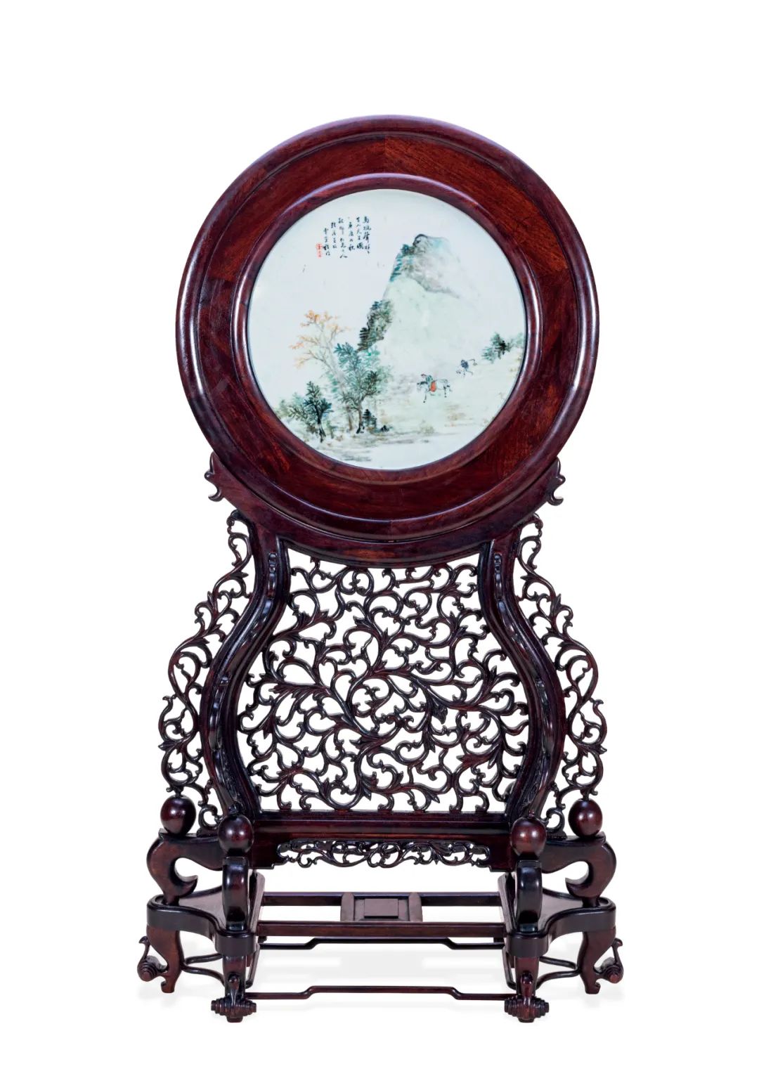 翡翠是一种最珍贵、价值最高的玉石,被称为“玉石之冠”。还由于深受东方一些国家和地区人们的喜爱,因而被国际珠宝界称为“东方之宝”。此器体量硕大,以大块翡翠雕琢而成,质地精良,远观宝光莹莹,近触细腻莹洁。盖瓶扁圆形,瑞兽钮覆盅式盖,子母口。瓶身束颈溜肩,弧腹,高圈足略外撇。整体造型修长典雅。瓶颈左右两侧雕作象首衔环式样,鼻圈绕圆形活环为耳。瓶身刻宝相花卉纹,工艺精到,构图饱满和谐。整器画面动中有静,静中有动,于精美之处彰显逸趣。整器雕刻刀法细腻、精准,刻画流畅、生动,选材上佳,殊为难得。尺寸:长 33cm,宽 21.5cm,高 15cm参阅:《螽斯衍庆》(总本)清乾隆年南府朱墨抄本,故宫博物院藏《螽斯衍庆》是清代宫廷庆典承应戏中“皇太后万寿圣诞承应”、“皇帝万寿圣诞承应”、“皇后千秋承应”和“皇帝大婚礼成承应”剧目之一。清乾隆皇帝六旬大庆、同治和光绪二帝大婚都曾承应此剧。本剧演的是天下和平,圣主仁恩施于内外。九天圣母召保护麟趾婴儿的送圣郎君同往神州,呈献螽斯麟趾之祥,以兆六宫子孙繁衍兴旺。又有天福和天寿二星君同行,敬襄盛事。御筵前,九天圣母献《多子图》。戏中,九天圣母慈慧温柔,含宏广大,酝生生不息之机,护佑皇宫,化育群生,护持孩稚。此剧用“螽斯”之名寓意后妃之间和睦相处,皇室子孙众多。此紫檀螽斯衍庆锦地纹书箱应为宫廷盛装《螽斯衍庆》的专用书箱,此盒整体呈长方形,材质为紫檀,上面锦地纹,中心书“螽斯衍庆”四字。盒分为上下两层。盒边侧雕竹编纹,雕琢细腻,线条刚劲饱满,此品做工费时费工,匠心独运。乾隆工艺明显,具有极高的艺术及收藏价值。来源:纽约佳士得,2013年春拍,Lot 1561拍品敞口倭角,弧腹,圈足。腹内壁施松石绿釉,外壁以金彩为地绘麻姑献寿图,人物纤毫毕现,印证了“嘉庆所绘人物亦有极精者”的记载。仕女造型与同时代画家改琦、王素类似。东晋时期由葛洪著作的文献《神仙传》中讲述麻姑是一位勤劳善良又美丽的南城人,因积累了不少功德,后而得道成仙,成为下八洞神仙之一的女寿仙,非常适宜作为给女性祝寿的礼品,高贵典雅,赏心悦目。相同制式里湖南省博物馆藏有同等纹饰、样式盖碗,不过尺寸较小,款识为「大清道光年制」。作者简介:叶震嘉,生卒年不详,别名叶振嘉,陶瓷美术家。1956年在景德镇陶瓷美术生产合作社供职,1958年在景德镇艺术瓷厂供职,1959年由景德镇市人民政府授予“陶瓷美术家”称号。擅长粉彩人物,其作品布局简约、主题突出,色彩明快鲜艳、衣纹线条流畅,立体感极强,显得功底深厚。作品撇口,短颈,丰肩,直腹,口沿金边,饰回纹、如意纹,肩部饰蕉叶纹、夔龙纹,底部饰莲瓣纹。通体以金彩万花为地,富丽而又清雅;以蝙蝠、如意、钱币纹做边框,两面开光内绘珐琅彩人物故事。一面绘大富贵亦寿考,作品以唐代名将郭子仪遇仙的古典故事为题材,作品绘云中仙女,立于祥云之上,目视郭子仪,旁边站侍女,人物形态生动,衣纹采用没骨画法,笔法细腻,青松峻石,勾描有致,珐琅敷染讲究冷暖变化,清丽高华。一面绘福禄寿喜,寓意“百子百福”、“高官厚禄”、“延年益寿”、“欢天喜地”,画面绘四星相聚崖前苍松之下,人物造型优美,形态兼备,没骨法画衣纹,设色妍丽,处处可见匠心。富贵寿考、福禄寿喜是常用题材,爱好收藏的达官贵人日思夜想高官显爵、子孙满堂、延年益寿,契合中国人的美好愿望。本品八屏成堂,红木攒框,每屏镶嵌浅绛山水人物瓷板七件,人物描绘细腻传神,运笔简练,花鸟灵动富有情趣,山水笔法老辣大方,浅绛色彩纯正,彩料浓淡分布恰到好处。五十六片精彩瓷板汇聚一堂,为厅堂陈设审美收藏不可多得之物。题识:谁买洞庭秋,黄鹤楼头,槐花半老桂花稠。才送斜阳西岭去,月上镰钩。漭漭大荒流,烟净云收,万条银线接天浮。不用画船沽酒去,我自神游。庚辰(1880)春月录板桥句于昌江吟香馆。宕愚道人写(愚、道人)著录:《浅绛瓷笺》陈树群、俞吉伟,崇文书局,2022,P320、21本块瓷板是国内目前发现的同时代尺寸最大的浅绛瓷板。整块横版作者以洞庭秋月为题,裁八百里洞庭一角,全图用笔淡雅,远山或浓或淡,都以干枯的笔勾皴,疏朗简秀,清爽潇洒。山间丛林茂密,点缀村舍,茅亭,水中则有渔舟垂钓。整个画面林峦浑秀,草木华滋,充满了隐者悠游林泉,萧散淡泊的诗意,散发出浓郁的文人气息。作者将诗、书、画融为一体,不重形似,笔法简练精到,山和水布置疏密得当,层次分明,但觉江水茫茫,天水一色,令人心旷神怡。本拍品的整体构图与黄公望被誉为“山水第一神品”的《富春山居图》有异曲同工之妙,可见作者对黄公望演习颇深,深的其浅绛山水之妙,虽作者愚道人无法考证其人生际遇,但有如此恢宏作品存世,也是其人生浓墨重彩的一笔。题识:试鼓丘中琴,便看幽人出。小松程崇楷写。(崇楷)碧梧清暑 己卯(1879年)首夏雪笠程门写(程、门)虞阶漕帅大人钧鉴著录:《浅绛彩瓷品鉴》,刘杨,江西教育出版社,P30说明:上款人苏凤文,清贵州贵筑(今贵阳)人,字虞阶。道光举人。同治元年(1862)以广西左江道迁按察使。四年迁布政使。六年授广西巡抚。十年擢漕运总督,旋因病解职。同年程门作山水瓷板题款“路穿松坞翠阴斜 己卯首夏,虞阶漕帅大人钧鉴,雪笠程门写”景德镇博物馆藏。(见于陈树群《烟云寄兴—程门大事