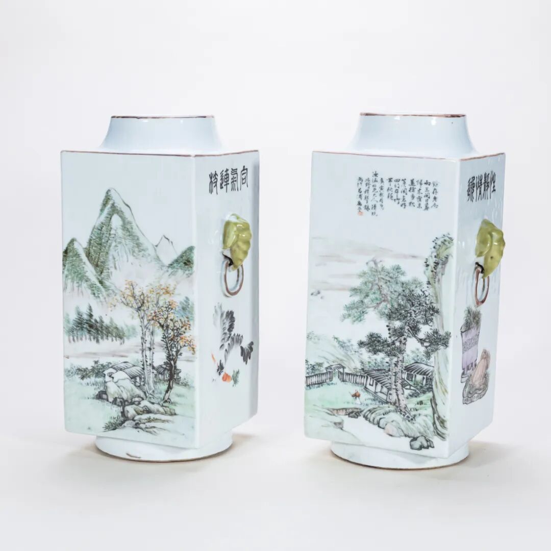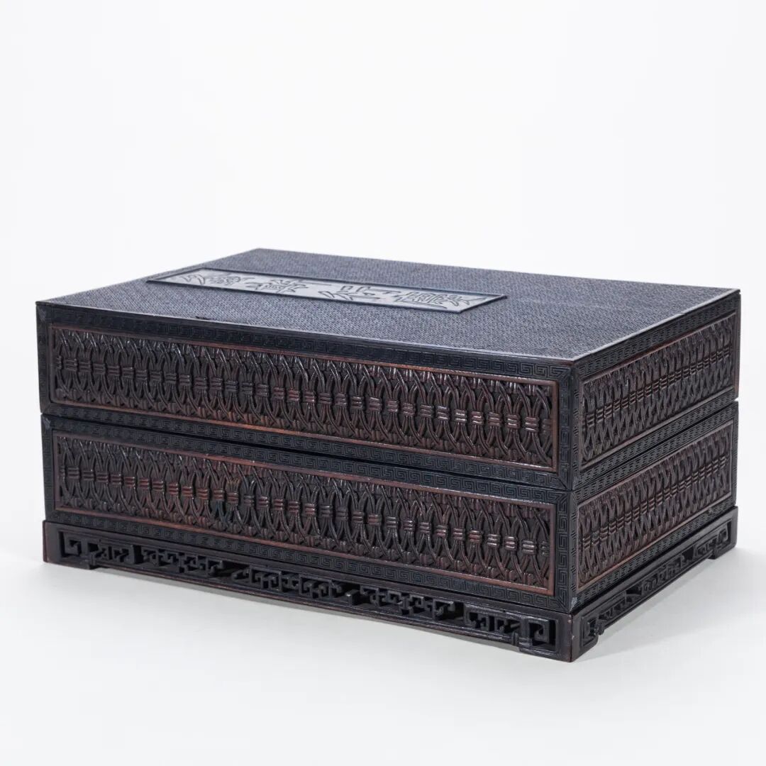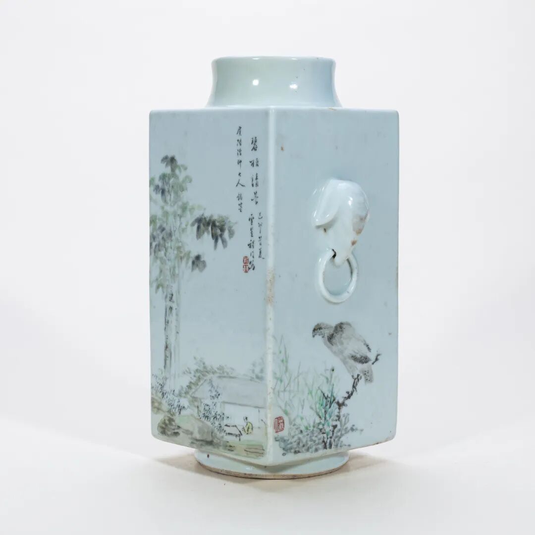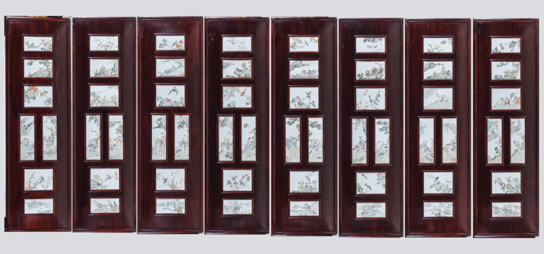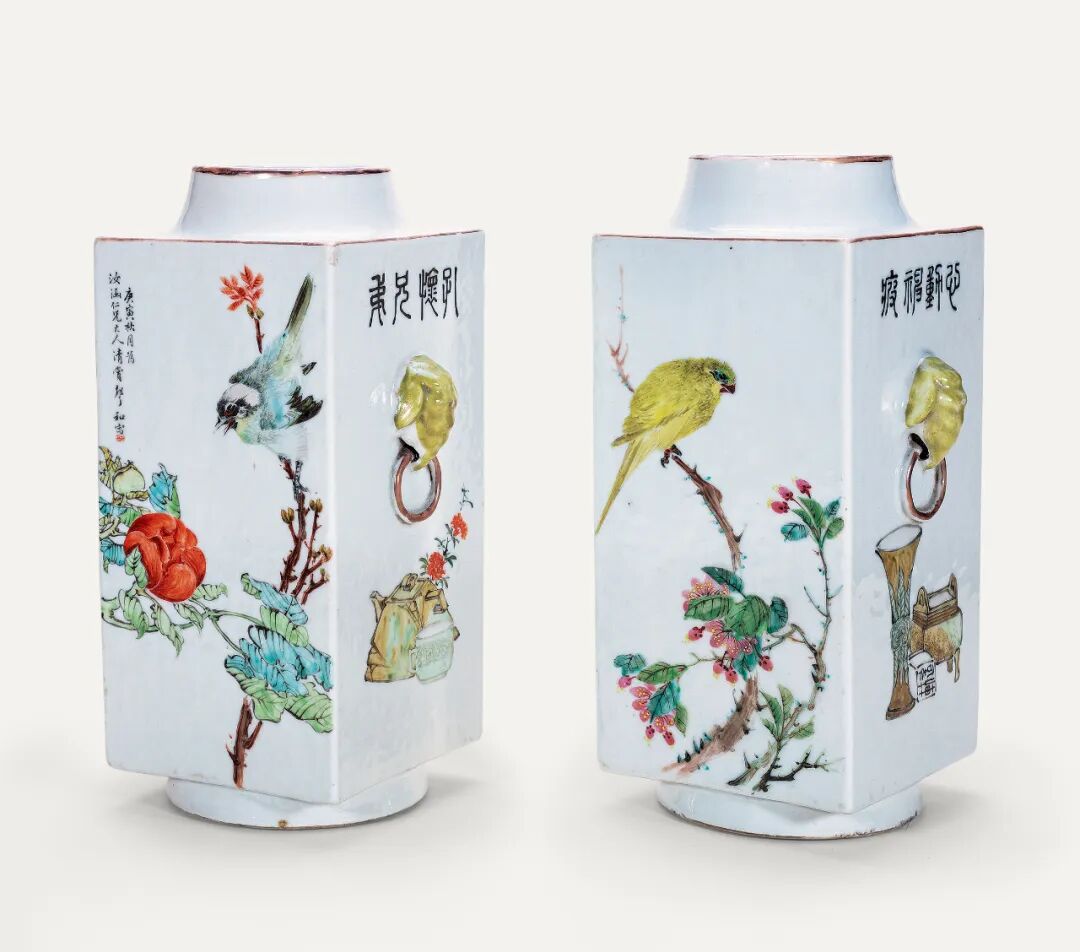 翡翠是一种最珍贵、价值最高的玉石,被称为“玉石之冠”。还由于深受东方一些国家和地区人们的喜爱,因而被国际珠宝界称为“东方之宝”。此器体量硕大,以大块翡翠雕琢而成,质地精良,远观宝光莹莹,近触细腻莹洁。盖瓶扁圆形,瑞兽钮覆盅式盖,子母口。瓶身束颈溜肩,弧腹,高圈足略外撇。整体造型修长典雅。瓶颈左右两侧雕作象首衔环式样,鼻圈绕圆形活环为耳。瓶身刻宝相花卉纹,工艺精到,构图饱满和谐。整器画面动中有静,静中有动,于精美之处彰显逸趣。整器雕刻刀法细腻、精准,刻画流畅、生动,选材上佳,殊为难得。尺寸:长 33cm,宽 21.5cm,高 15cm参阅:《螽斯衍庆》(总本)清乾隆年南府朱墨抄本,故宫博物院藏《螽斯衍庆》是清代宫廷庆典承应戏中“皇太后万寿圣诞承应”、“皇帝万寿圣诞承应”、“皇后千秋承应”和“皇帝大婚礼成承应”剧目之一。清乾隆皇帝六旬大庆、同治和光绪二帝大婚都曾承应此剧。本剧演的是天下和平,圣主仁恩施于内外。九天圣母召保护麟趾婴儿的送圣郎君同往神州,呈献螽斯麟趾之祥,以兆六宫子孙繁衍兴旺。又有天福和天寿二星君同行,敬襄盛事。御筵前,九天圣母献《多子图》。戏中,九天圣母慈慧温柔,含宏广大,酝生生不息之机,护佑皇宫,化育群生,护持孩稚。此剧用“螽斯”之名寓意后妃之间和睦相处,皇室子孙众多。此紫檀螽斯衍庆锦地纹书箱应为宫廷盛装《螽斯衍庆》的专用书箱,此盒整体呈长方形,材质为紫檀,上面锦地纹,中心书“螽斯衍庆”四字。盒分为上下两层。盒边侧雕竹编纹,雕琢细腻,线条刚劲饱满,此品做工费时费工,匠心独运。乾隆工艺明显,具有极高的艺术及收藏价值。来源:纽约佳士得,2013年春拍,Lot 1561拍品敞口倭角,弧腹,圈足。腹内壁施松石绿釉,外壁以金彩为地绘麻姑献寿图,人物纤毫毕现,印证了“嘉庆所绘人物亦有极精者”的记载。仕女造型与同时代画家改琦、王素类似。东晋时期由葛洪著作的文献《神仙传》中讲述麻姑是一位勤劳善良又美丽的南城人,因积累了不少功德,后而得道成仙,成为下八洞神仙之一的女寿仙,非常适宜作为给女性祝寿的礼品,高贵典雅,赏心悦目。相同制式里湖南省博物馆藏有同等纹饰、样式盖碗,不过尺寸较小,款识为「大清道光年制」。作者简介:叶震嘉,生卒年不详,别名叶振嘉,陶瓷美术家。1956年在景德镇陶瓷美术生产合作社供职,1958年在景德镇艺术瓷厂供职,1959年由景德镇市人民政府授予“陶瓷美术家”称号。擅长粉彩人物,其作品布局简约、主题突出,色彩明快鲜艳、衣纹线条流畅,立体感极强,显得功底深厚。作品撇口,短颈,丰肩,直腹,口沿金边,饰回纹、如意纹,肩部饰蕉叶纹、夔龙纹,底部饰莲瓣纹。通体以金彩万花为地,富丽而又清雅;以蝙蝠、如意、钱币纹做边框,两面开光内绘珐琅彩人物故事。一面绘大富贵亦寿考,作品以唐代名将郭子仪遇仙的古典故事为题材,作品绘云中仙女,立于祥云之上,目视郭子仪,旁边站侍女,人物形态生动,衣纹采用没骨画法,笔法细腻,青松峻石,勾描有致,珐琅敷染讲究冷暖变化,清丽高华。一面绘福禄寿喜,寓意“百子百福”、“高官厚禄”、“延年益寿”、“欢天喜地”,画面绘四星相聚崖前苍松之下,人物造型优美,形态兼备,没骨法画衣纹,设色妍丽,处处可见匠心。富贵寿考、福禄寿喜是常用题材,爱好收藏的达官贵人日思夜想高官显爵、子孙满堂、延年益寿,契合中国人的美好愿望。本品八屏成堂,红木攒框,每屏镶嵌浅绛山水人物瓷板七件,人物描绘细腻传神,运笔简练,花鸟灵动富有情趣,山水笔法老辣大方,浅绛色彩纯正,彩料浓淡分布恰到好处。五十六片精彩瓷板汇聚一堂,为厅堂陈设审美收藏不可多得之物。题识:谁买洞庭秋,黄鹤楼头,槐花半老桂花稠。才送斜阳西岭去,月上镰钩。漭漭大荒流,烟净云收,万条银线接天浮。不用画船沽酒去,我自神游。庚辰(1880)春月录板桥句于昌江吟香馆。宕愚道人写(愚、道人)著录:《浅绛瓷笺》陈树群、俞吉伟,崇文书局,2022,P320、21本块瓷板是国内目前发现的同时代尺寸最大的浅绛瓷板。整块横版作者以洞庭秋月为题,裁八百里洞庭一角,全图用笔淡雅,远山或浓或淡,都以干枯的笔勾皴,疏朗简秀,清爽潇洒。山间丛林茂密,点缀村舍,茅亭,水中则有渔舟垂钓。整个画面林峦浑秀,草木华滋,充满了隐者悠游林泉,萧散淡泊的诗意,散发出浓郁的文人气息。作者将诗、书、画融为一体,不重形似,笔法简练精到,山和水布置疏密得当,层次分明,但觉江水茫茫,天水一色,令人心旷神怡。本拍品的整体构图与黄公望被誉为“山水第一神品”的《富春山居图》有异曲同工之妙,可见作者对黄公望演习颇深,深的其浅绛山水之妙,虽作者愚道人无法考证其人生际遇,但有如此恢宏作品存世,也是其人生浓墨重彩的一笔。题识:试鼓丘中琴,便看幽人出。小松程崇楷写。(崇楷)碧梧清暑 己卯(1879年)首夏雪笠程门写(程、门)虞阶漕帅大人钧鉴著录:《浅绛彩瓷品鉴》,刘杨,江西教育出版社,P30说明:上款人苏凤文,清贵州贵筑(今贵阳)人,字虞阶。道光举人。同治元年(1862)以广西左江道迁按察使。四年迁布政使。六年授广西巡抚。十年擢漕运总督,旋因病解职。同年程门作山水瓷板题款“路穿松坞翠阴斜 己卯首夏,虞阶漕帅大人钧鉴,雪笠程门写”景德镇博物馆藏。(见于陈树群《烟云寄兴—程门大事