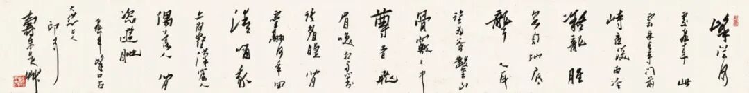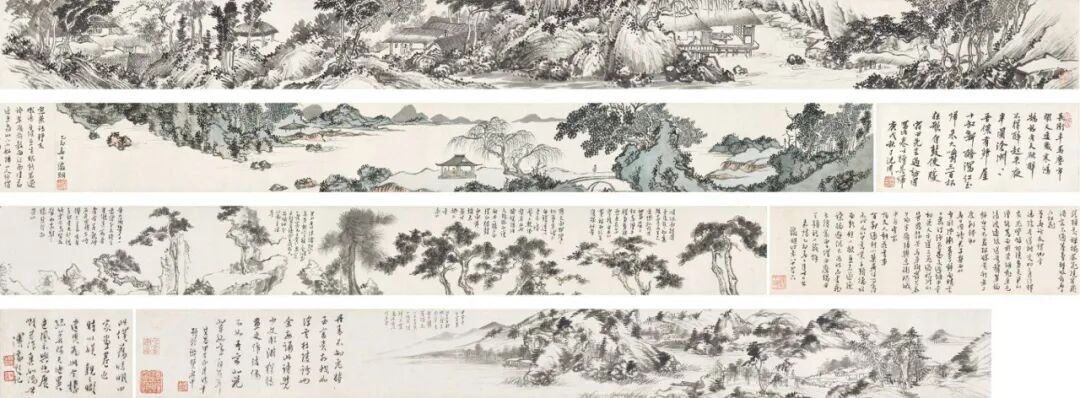 作品简介:《临明四家画卷》画心高仅三寸,长四米有余,作于溥心畬隐居西山戒台寺期间,依次临摹沈周《沧洲图卷》、文徵明《煎茶图并行书诗卷》、黄道周《松石图卷》与董其昌《北干山图卷》,各段题字均依原样誊写,是他早年临古力作,加之首次现身拍场,实属难能可贵。其中黄道周《松石图卷》现藏大阪市立美术馆,画面与溥心畬临本一一对应,溥氏擅绘松树,画法滥觞却甚少有人提及,拍品临黄道周一段,揭示其渊源,对于深入了解溥氏早年的画学渊源有着不可替代的价值。