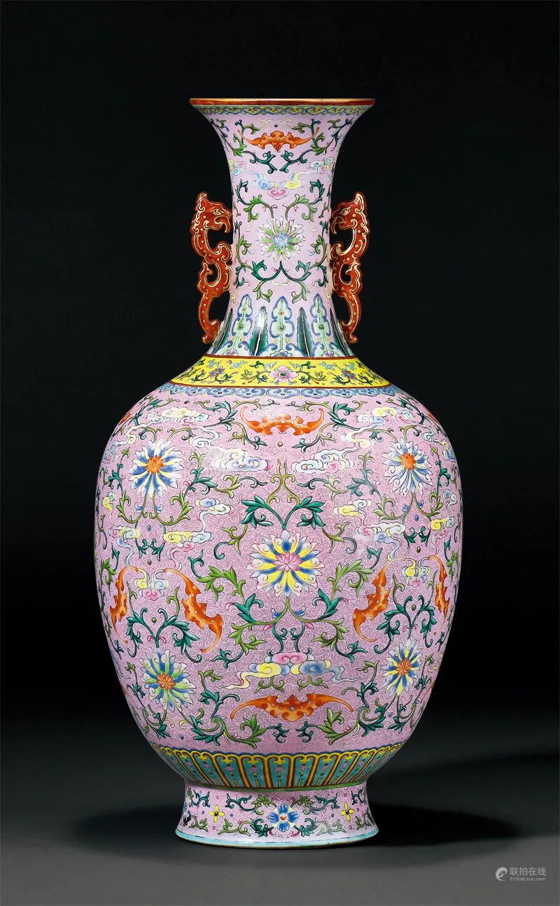 清乾隆 粉地洋彩锦上添花万福莲花纹夔龙耳瓶