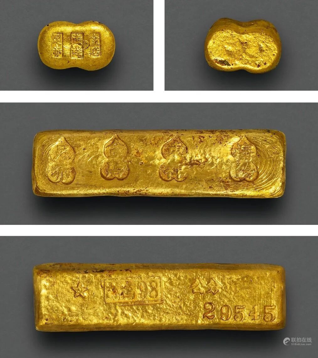 建国初期“东祥 金店 足赤”一两金锭、“沈阳 东祥 金店 足赤”十两金条各一枚,重量:31.1克、297.1克,十两金条背打“成色98”、编号“29545”及五角星形镰刀锤头党徽戳记。