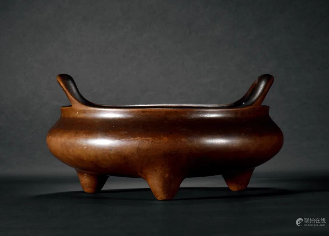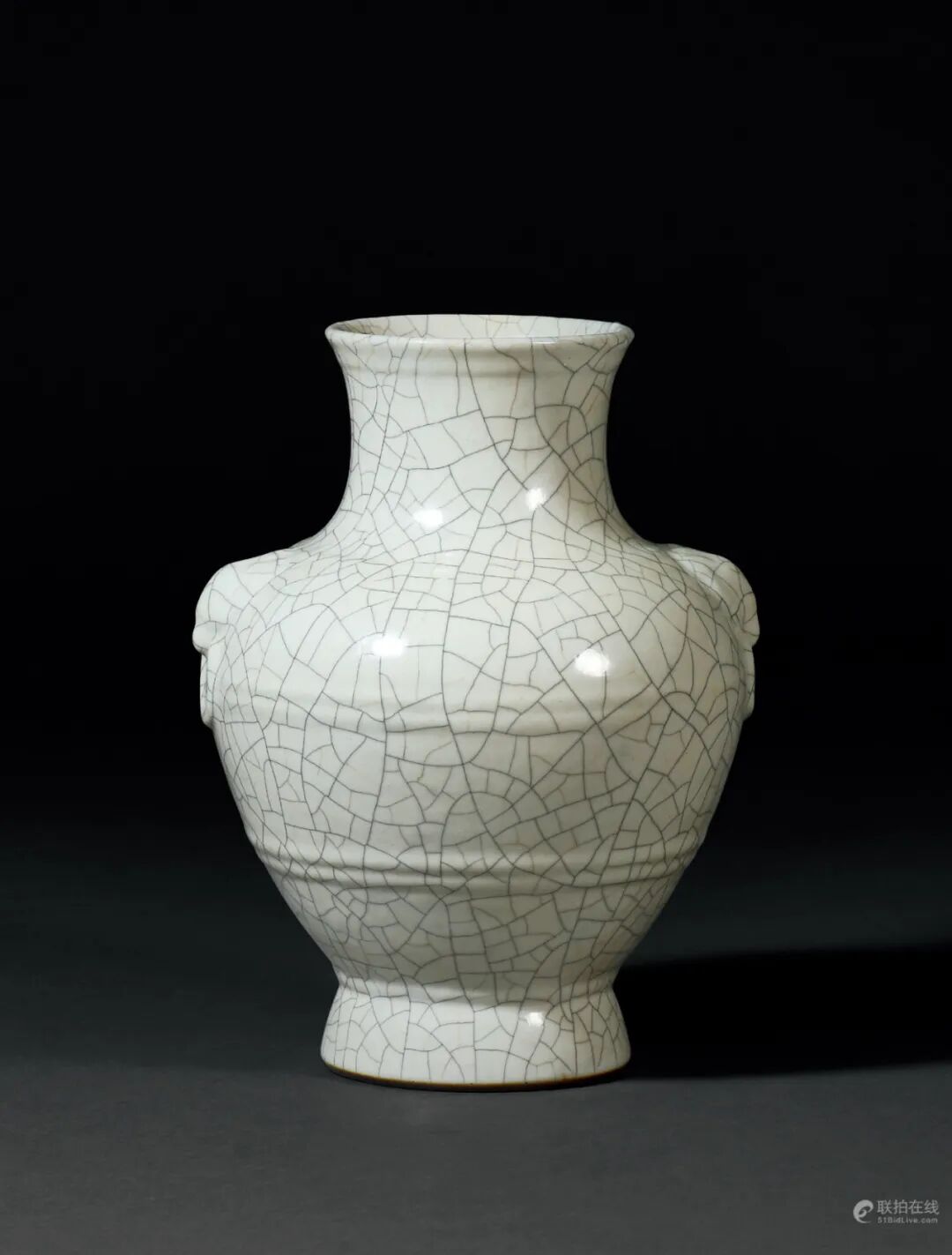 拍品与故宫博物院藏清雍正炉钧釉兽面衔环弦纹壶器形相同,此一造型另有茶叶末釉、窑变釉制品。其形源自商周青铜罍而略有损益,撇口束颈,肩部丰腴,两侧对称置铺首耳,腹下渐收,通体以弦纹装饰,下承圈足。施仿哥釉,釉面光润,金丝铁线开片自然分布,圈足底端施酱釉,以模拟“铁足”之态。拍品融古铜器造型之端庄与宋瓷釉色之幽雅于一身,展现了雍正时期宫廷仿古艺术的独特魅力。