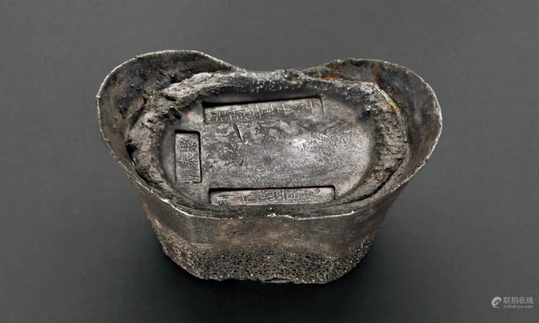 清代山东“聚泰炉 招财童子至 利市仙官来”五十两开炉吉语锭一枚,重量:1884.2克;开炉吉语锭是银炉在岁初开炉铸宝时,特别铸造的镇炉宝银,通常不流通,不仅成色足,工艺也较普通品更为精美,因铸造数量稀少、铭文寓意吉祥,常被作为镇宅之宝,深受藏家的追捧;拍品锭型规整,宝面开阔,三方戳记平正清晰,一侧外壁阴刻花码“〩”(9),另有经手小戳二处,浆色自然深沉,蜂窝均匀细密,内敛亮丽光泽,品相颇佳。