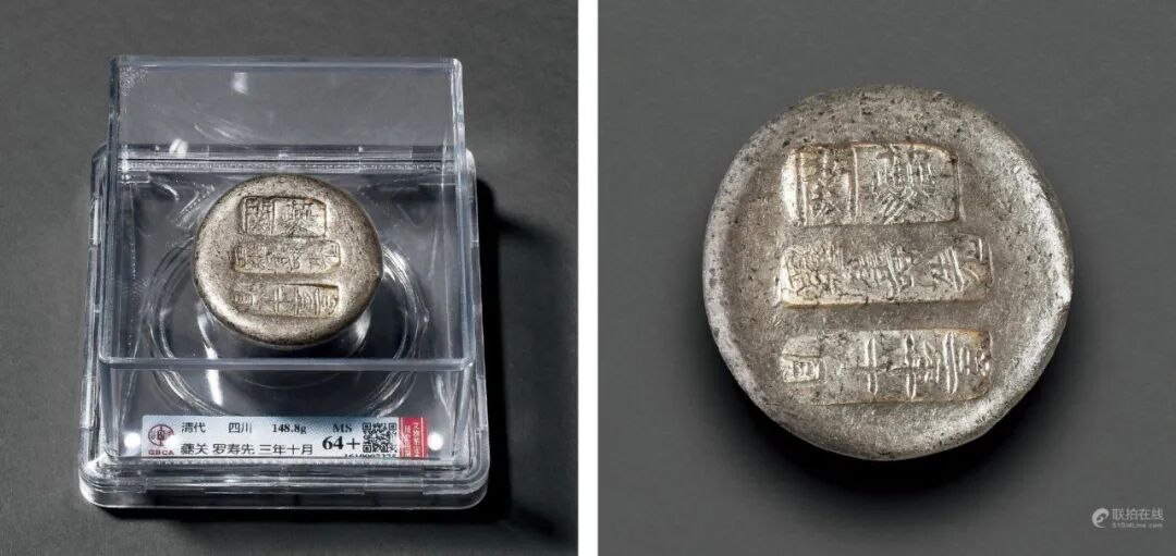 清代四川“夔关 罗寿先 三年十月”三戳四两圆锭一枚,重量:148.8克;夔关税锭所见多为十两形制,五两以下小克重者,系关税征收中的奇零尾鞘银,铸额原本无多,历经各朝熔毁改铸,存世数量远较十两锭稀少,公开拍卖鲜有出现;拍品造型呈圆饼状,面平底弧,三戳平行横打,字口完整清晰,气孔莹亮,品相全美,堪称小锭至臻。