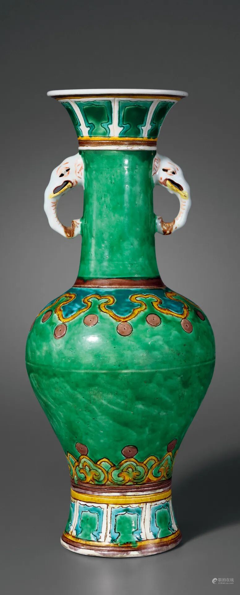 明嘉靖 绿地素三彩暗刻如意纹象耳瓶