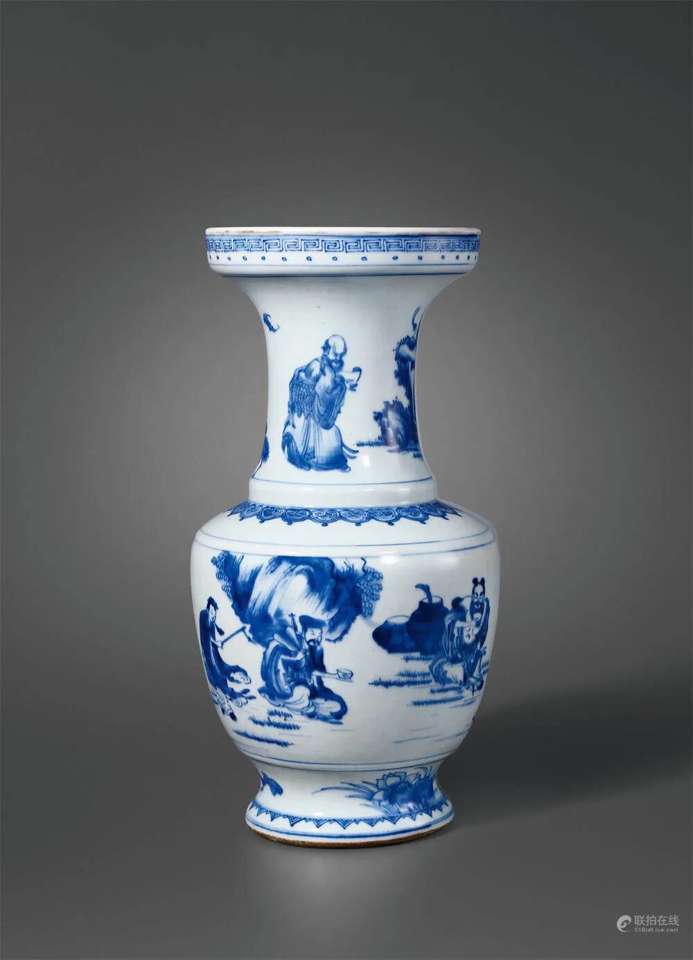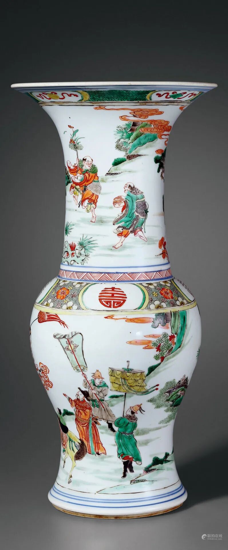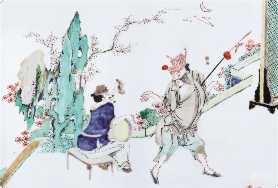 拍品估价:200,000 - 500,000 人民币1.纽约通运公司(Ton-Ying & Co., New York)旧藏;2.威廉柯宾氏(William Randolph-Hearst)珍藏1.纽约美国艺术协会/画廊拍卖,1932年4月16日,通运公司珍藏中国陶瓷书画丝绸玉雕与珐琅器专场拍卖,编号526;2.纽约帕克本纳特画廊拍卖,1963年4月5日,编号340;3.纽约佳士得,2010年9月17日,编号1385;1.美国波特兰艺术博物馆(Portland Art Museum):2.威廉柯宾氏珍藏中国陶瓷精选展,1964年3月1日29日,编号54展览:出借展览于美国波特兰艺术博物馆,2006年6月1日-2010年6月22日拍品为康熙朝五彩陈设精品大器,形制挺拔俊朗,设色明快艳丽。器身通景以五彩绘“开芳宴”月下人物赏戏图,饰戏者一人击板,一人持戟表演,嬉闹纷然,神情动作均极豪宕滑稽,令人忍俊不禁,叹为神妙;旁有才子佳人赏戏,果馔罗列,美酒佳肴,然乐而忘食,神情专注,一派忘情嬉乐气象,人物形象顶天立地,极富时代特征。置于厅堂陈设,俊雅别致,尤添风韵。“开芳宴”为古时流行的元宵庆祝活动,多由夫妻二人举办,两人对坐共饮,欣赏戏曲杂耍,借以传达夫妻间恩爱信息的习俗,是独属于夫妻二人的家宴。后多借寓夫妻恩爱和睦。