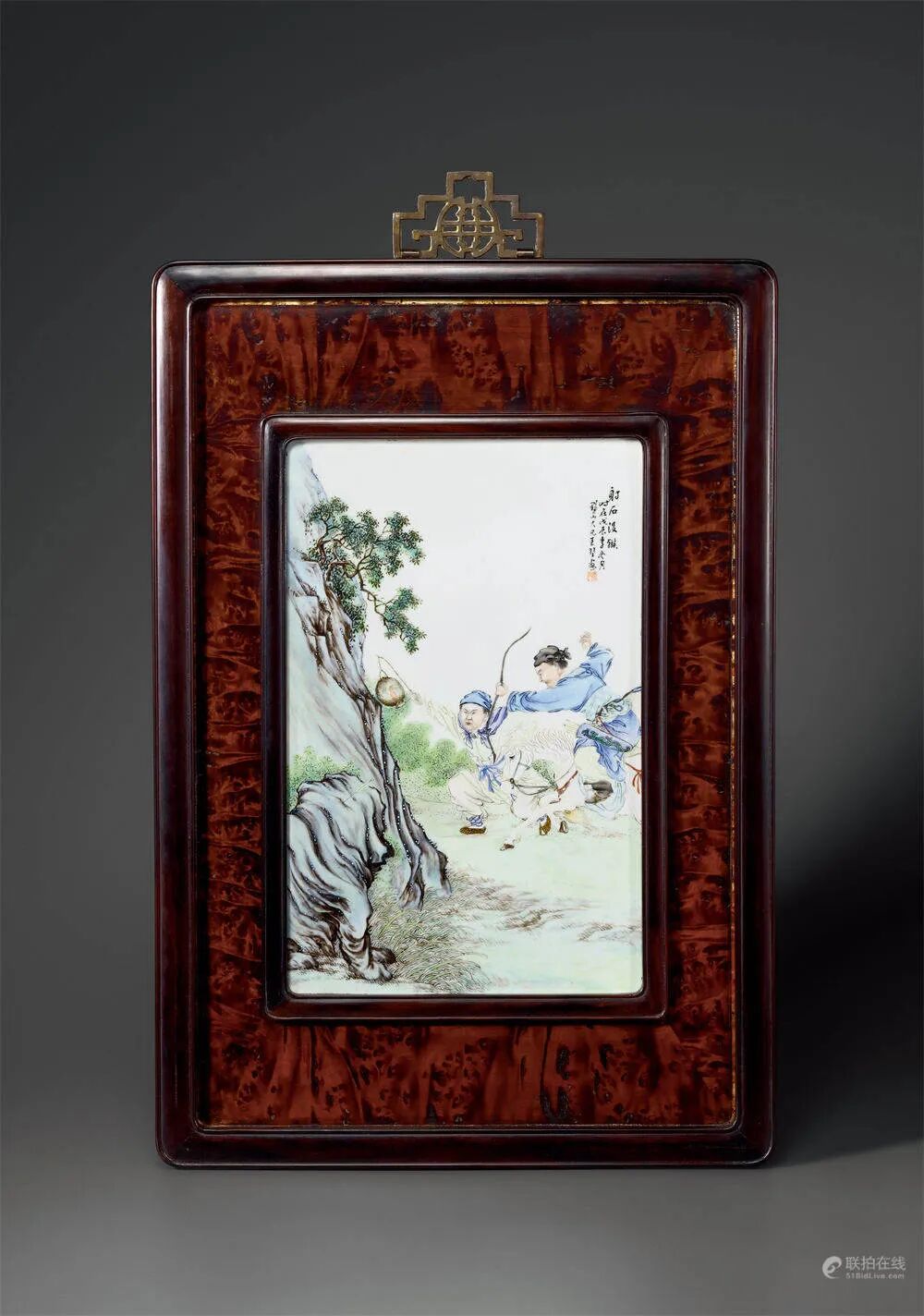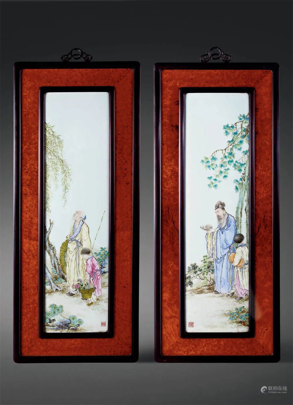 民国 王琦作粉彩“渊明爱菊”、“东坡爱砚”图瓷板一对尺寸:75.5×19.8 cm(瓷板);94.8×39.5 cm(带框)拍品估价:600,000 - 900,000 人民币参阅:《珠山八友》上卷,江西美术出版社,2004年,页171、196-197,图91、108王琦尤善绘粉彩人物,草书题记,诗、书、画俱佳,最擅拿捏人物神态,因受西洋画像晕染之法的影响,其画中人物头部及手部所衬明暗变化特征鲜明,可谓民国粉彩人物画开山鼻祖,对近代文人瓷画影响深远。拍品成对保存,以四爱故事中“渊明爱菊”及“东坡爱砚”为材绘就。所绘“渊明爱菊”一画中,绿柳依依,树干虬劲,陶渊明老者之态,执一手杖,举头凝视,侧旁童子手提竹篮,其内菊花灿烂婉约,颇具闲情逸趣,末端落朱印“迷”。另有“东坡爱砚”一画,梧桐掠影,高耸入云,东坡双手捧砚,神情专注,爱不释手,侧旁孩童侍之,末端落朱印“碧珍”。整器画意高洁清幽,绘笔苍劲老练,颇为传神。王琦粉彩人物瓷画多有传世,如《珠山八友》中著录有王琦作粉彩“小红低唱我吹箫”图瓷板,其人物开脸与拍品颇为相类,另有王琦作粉彩“东坡爱砚”图瓶,其题材与拍品相类,可资参阅。