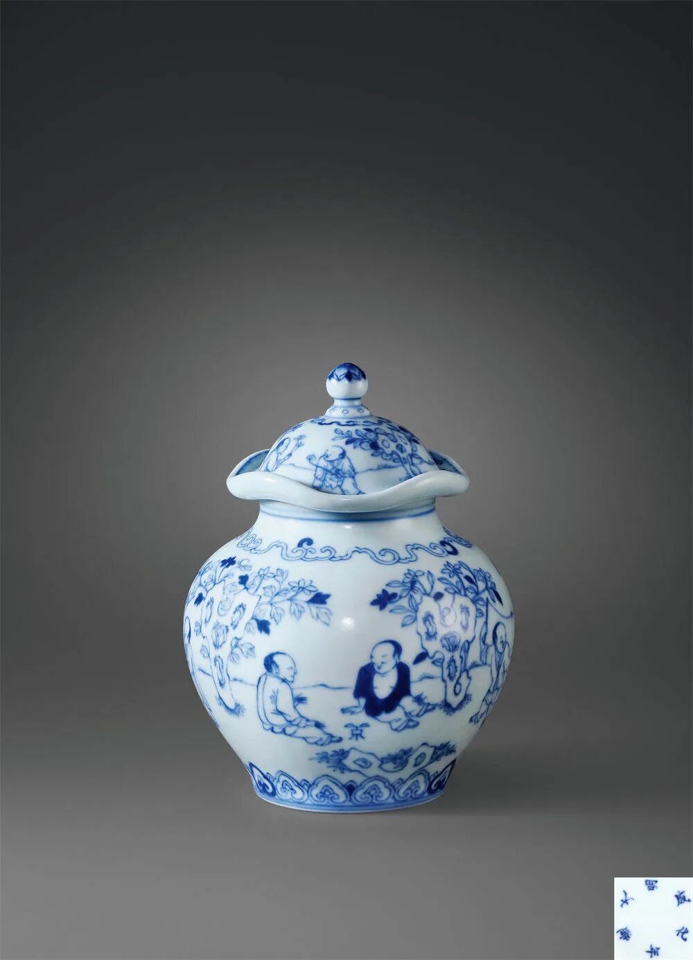 拍品估价:600,000 - 800,000 人民币参阅:伦敦苏富比,1998年6月16日,编号258拍品造型饱满,罐身束颈鼓腹,盖以荷叶之形作拟,盖沿翻转波折,曲度开合有致,富有流动感,恰似荷叶被风吹拂之状。釉面肥腴光润,盖面、罐身通以青花绘饰庭院婴戏图为主题纹饰,院中花草丰茂,亭台错落,灵石嶙峋,孩童两两成对,或追玩嬉闹,或席地而坐,持瓶插莲花者寓意连生贵子,拉拽鸠车者祈祝平安吉祥,其动作神态各不相同,刻画灵动,细腻入微,盖钮绘饰花卉纹,肩部及近足处分饰卷云纹与如意云头纹。整器布局紧凑,场景生动,绘工娴熟,青花妍丽明快,为乾隆时期精雅细作,殊堪赏玩。