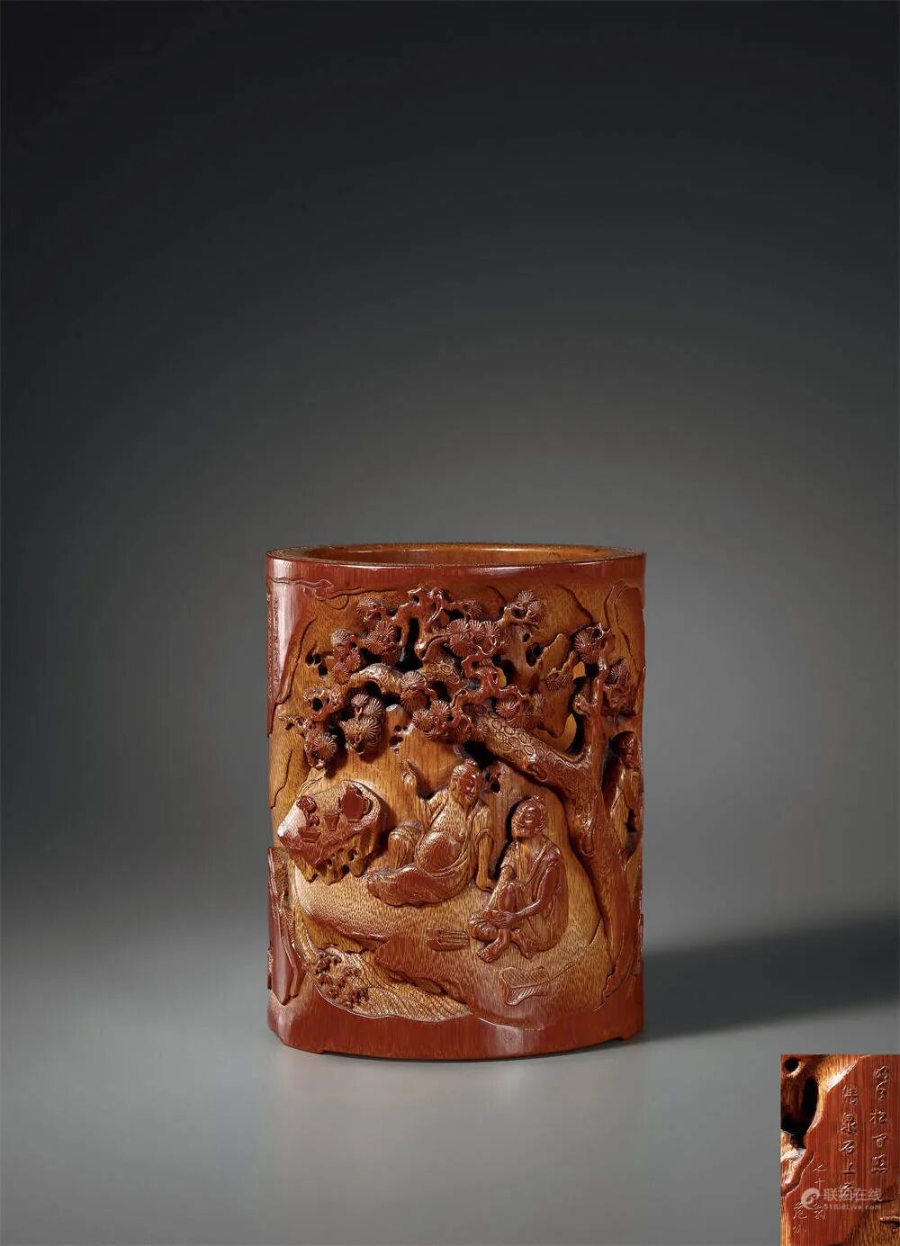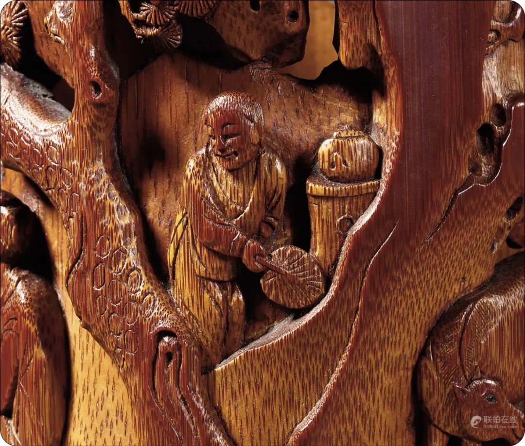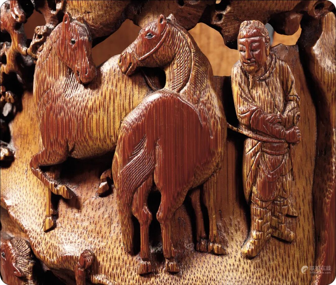 尺寸:Diam 12.7 cm; H 16.1 cm拍品估价:600,000 - 800,000 人民币拍品为清早期竹雕文房佳作,竹质坚实致密,包浆醇厚莹亮,红润自然,手感温润。器呈直筒状,口部环饰回纹,线条清晰流畅,下设三矮足。器身外壁以高浮雕、镂雕、兼以透雕等技法,雕饰高仕骏马图,崇山峻岭,奇木古松立于山石嶙峋间,古松苍幽遒劲,松梢上祥云环绕,一轮明月半隐祥云间,松荫下两高仕席地而坐,神态悠然,谈笑风生,人物神情刻划生动传神,衣褶清晰,婉转自然,细节如发须,手部等刻画毫不含糊,小童围炉煮茶侍奉,周围山石之间,泉水潺潺,与作者落款“明月松间照,清泉石上流”完美呼应,别具诗情画意。笔筒另侧雕饰四只骏马膘肥体壮,形态各异,各具神情,于深山峻岭间或站或卧,雕刻细腻写实,别具生动,高仕手持缰绳,眉目宛然。整幅画面野逸悠绝,布局巧妙,章法紧凑,刀法遒劲爽利,人物、骏马刻划细腻,景物丰富,具有笔致墨韵,或大开大合,或精雕细琢,层次清晰,繁而不乱,宛若长卷。整器古韵自然,气韵高雅,诚属高手所为,不可多得。