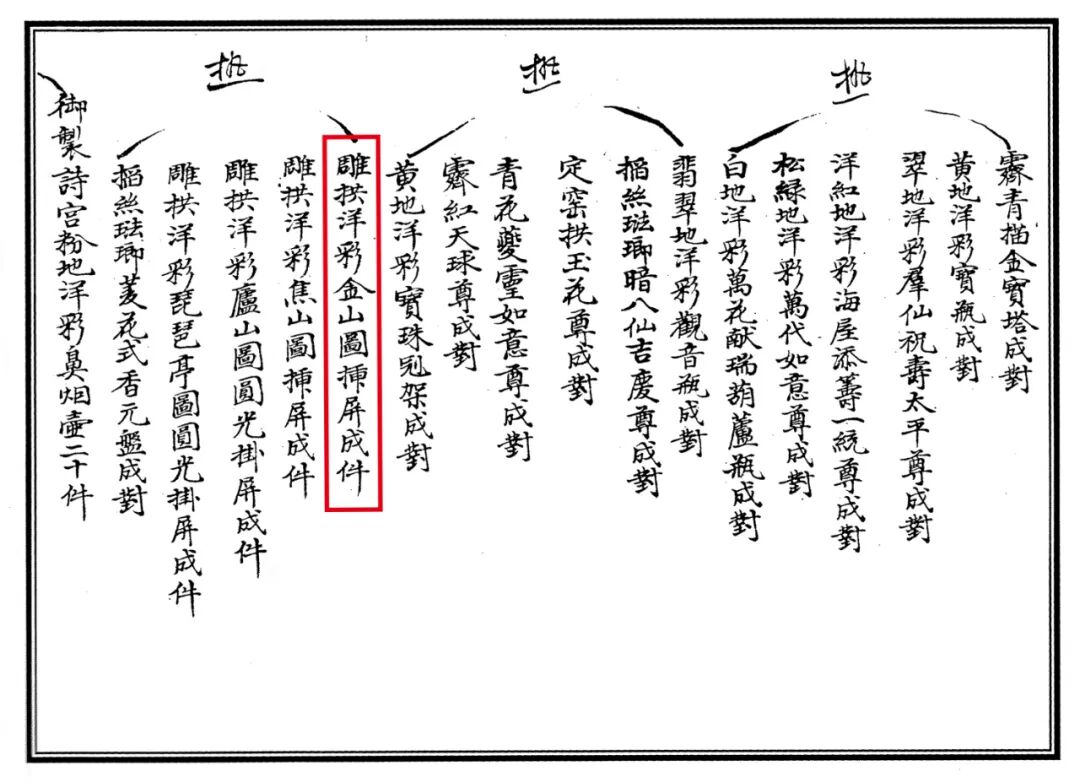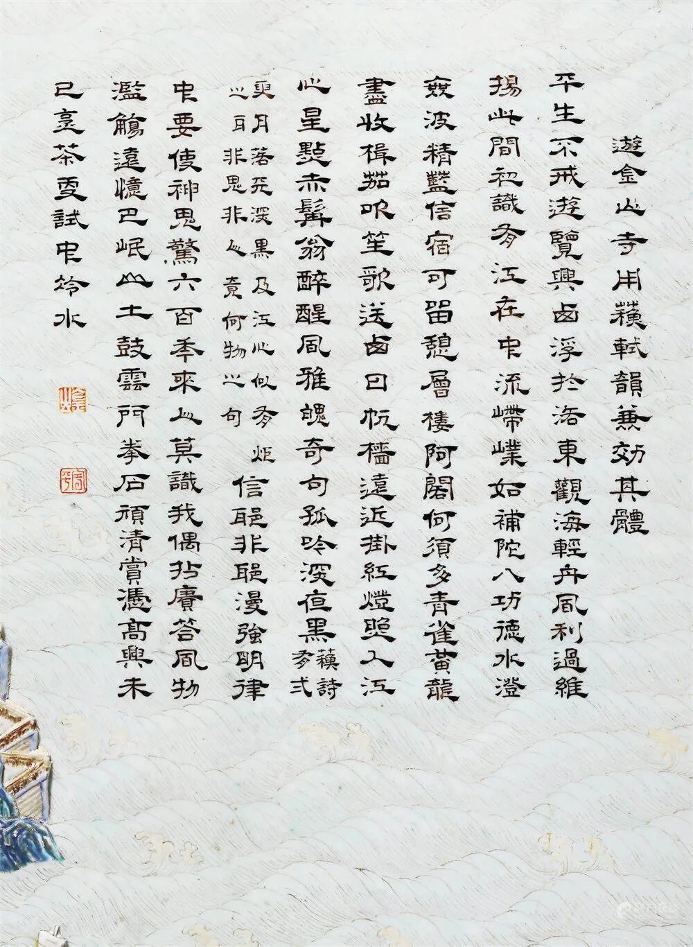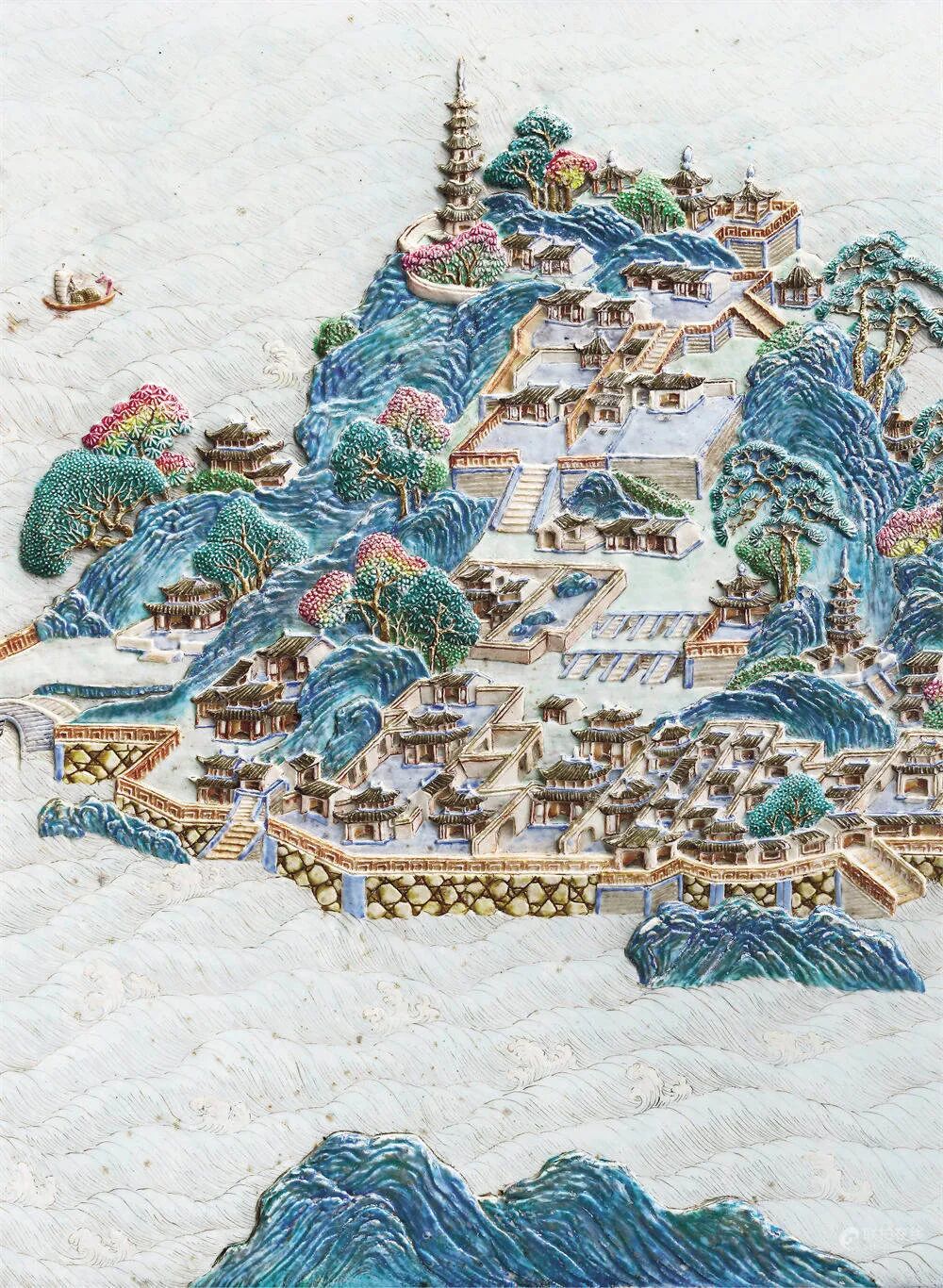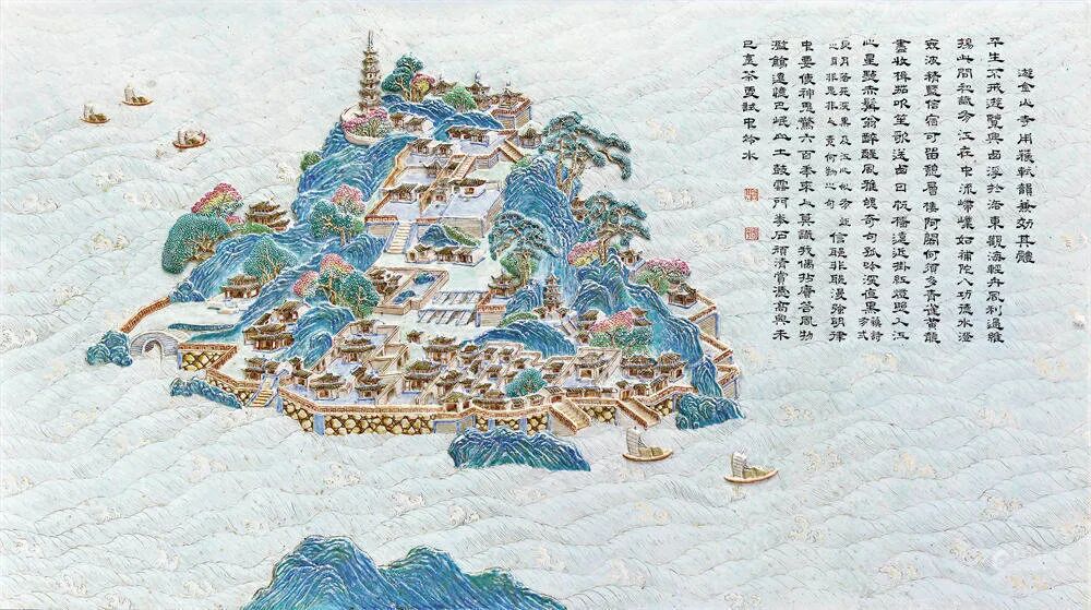 拍品估价:750,000 - 1,200,000 人民币记录:北京永乐(佳士得),2011年5月24日,编号8761.《清代官窑瓷器史·卷一》,中国画报出版社,2012年,页138;3.中国国家图书馆藏,《江南省行宫座落并各名胜图》,编号:地754809;4.《清高宗御制诗文全集(三)》,台北故宫博物院,1976年,页3-483;本件清乾隆雕瓷洋彩金山寺图墨彩御制诗文挂屏,采用复杂且精湛的制瓷工艺,以南巡图与金山寺行宫图为蓝本,题咏诵金山寺之御制诗,写实再现乾隆南巡中“胜概天下第一”之金山寺风景,为乾隆御窑雕瓷洋彩巨作,立体展现盛世人文风情,提供珍贵历史资料,代表了当时极高的制瓷技术,意义非凡,极为罕见。挂屏整体以江苏镇江金山寺风景为题材,洋彩绘长江波涛翻滚,浪涌奔腾,瓷胎堆塑江中船只鼓帆前行,金山岛树木苍天,寺宇楼阁层叠,慈寿塔高耸云霄,殿宇厅堂幢幢相衔,亭台楼阁层层相接,山寺浑然一体,整个金山仿佛一座橼摩栋接、丹辉碧映的寺庙,尽显“寺裹山”之奇特风格,为明清瓷器中罕有写实性浅浮雕风景作品。屏面左上方隶书题写乾隆御制诗《游金山寺用苏轼韵兼效其体》,尾落“金山”“平安”印章款。整器绘制精细,书写工整,设色华美,以近立体形式将乾隆盛世时期金山寺胜景重现,大气磅礴,甚为罕见,为研究乾隆皇帝南巡、镇江金山寺史料,以及乾隆时期粉彩瓷塑工艺等课题提供重要实物资料。乾隆所作《游金山寺用苏轼韵兼效其体》,效仿苏轼《游金山寺》诗体,并运用苏诗韵脚和平仄,抒发乾隆皇帝游山览河豪情雅兴,并表达对北宋文豪之推崇,此诗载于《清高宗御制诗文全集·御制诗二集》卷二十三,挂屏所书为乾隆御制诗全文,注释之句亦详细标注。字体书写工整隽丽,架构得当,与画屏盛景相和:平生不戒游览兴,西浮于洛东观海,轻舟风利过维扬,此间初识有江在。中流嵽嶫如补陀,八功德水澄无波,精蓝信宿可留憩,层楼阿阁何须多。青雀黄龙尽收楫,笳吹笙歌送西日,帆樯远近挂红灯,照入江天星点赤。髯翁醉醒风雅魄,奇句孤吟深夜黑,(苏诗有二更月落天深黑、江心似有炬火明、非鬼非人竟何物之句)信耶非耶漫强明,律中要使鬼神惊。六百年来人莫识,我偶拈庚答风物。滥觞远忆巴岷山,土鼓云门拳石顽,清赏凭高兴未已,烹茶更试中泠水。此件挂屏的烧造记录于《乾隆朝九江关呈贡档》中,“乾隆朝九江关监督海绍恭进:……雕拱洋彩金山图插屏成件(交热河)、雕拱洋彩焦山图插屏成件(交热河)、雕拱洋彩庐山图圆光挂屏成件(交热河)、雕拱洋彩琵琶亭图圆光挂屏成件(交热河)......”可知当时烧造了一系列类似工艺、材料且以各地风景名胜为主题的挂屏,交予热河行宫,即今日承德避暑山庄进行陈设装饰,其中“雕拱洋彩金山图插屏成件”即为拍品。档案中所载“九江关监督海绍”为汉军正白旗人,研究成果认为其主管御窑厂时间为乾隆五十一年三月至乾隆五十二年(见《清代官窑瓷器史·卷一》,页138,清代御窑厂督陶官吏一览表)。故金山寺瓷板应为乾隆五十一年三月至乾隆五十二年期间烧造,适时乾隆于四十九年结束其六次巡幸江南中的最后一次,此类挂屏或为咏诵、追慕途中风景所特别订烧,极具历史价值。