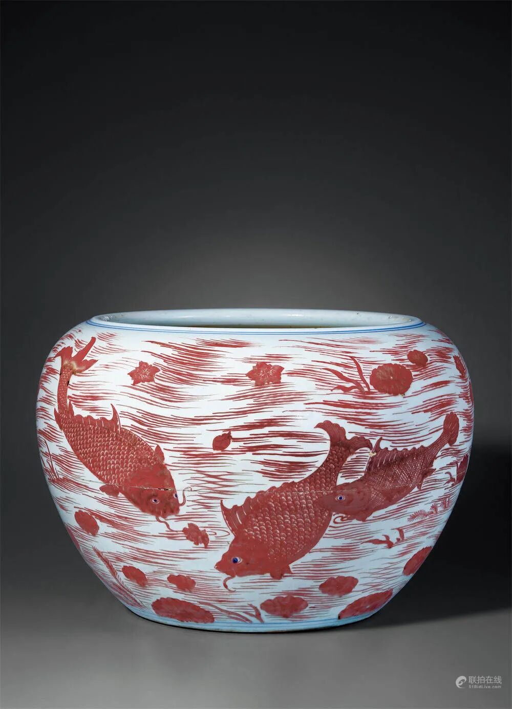 清康熙 釉里红鱼藻纹缸