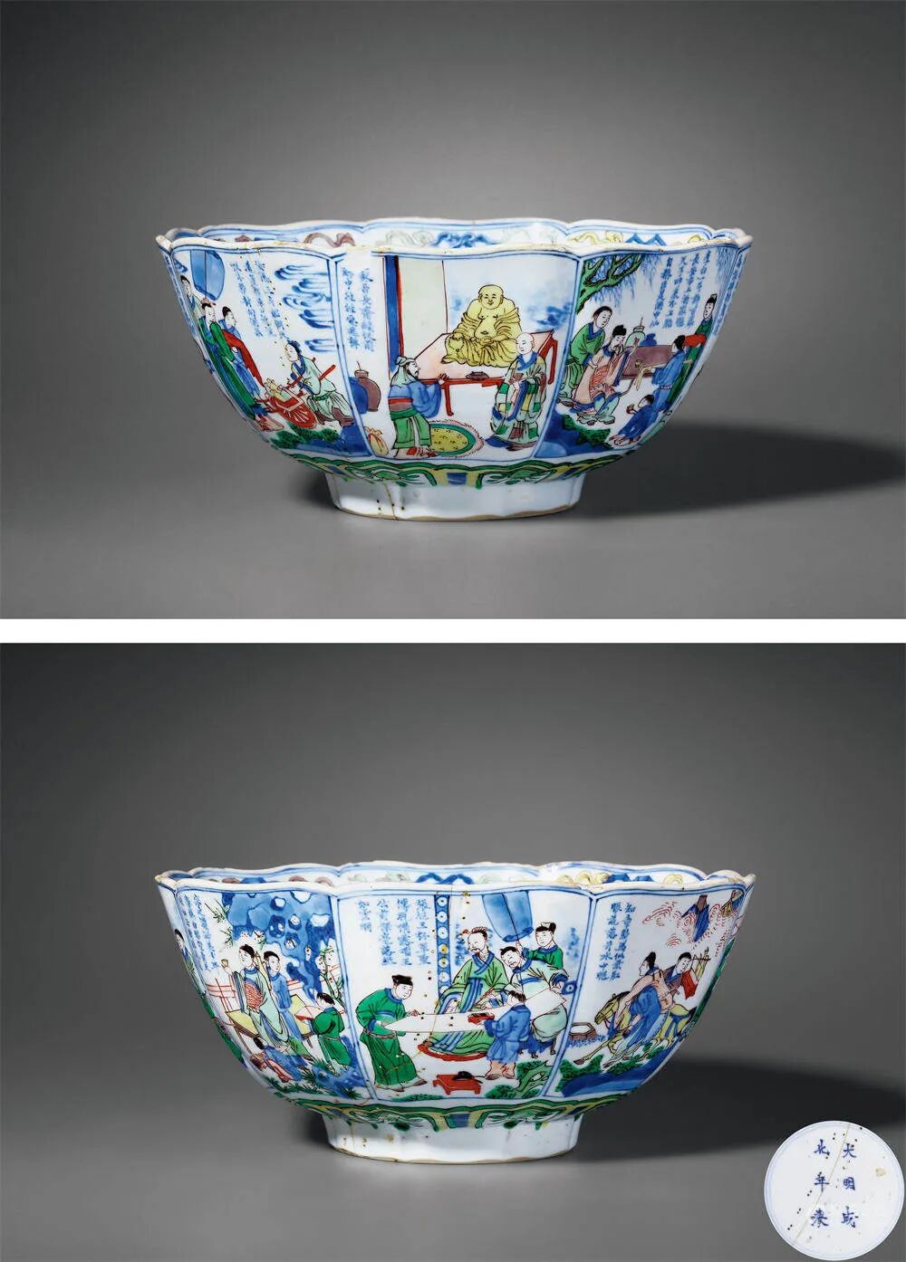 清康熙 青花五彩《饮中八仙歌》人物诗文葵口碗