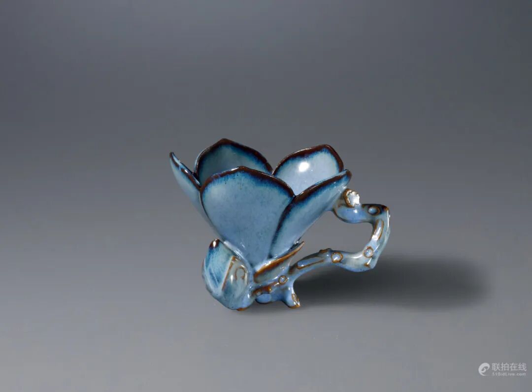 拍品估价:380,000 - 500,000 人民币1.北京翰海,2004年11月28日,编号1771;壁瓶,清代亦称“轿瓶”,乾隆皇帝喜以壁瓶插花装饰宫廷苑壁,在清宫《活计档》中可见多处命景德镇御窑厂烧造壁瓶的记载,更尤为喜好以御制诗装饰壁瓶。拍品作花叶形,叶柄为瓶口,造型别致清雅。叶面高浮雕花茎带出五只黄色豆荚,豆荚之间附坠露珠。瓶身以墨彩勾描绘叶之阴阳两面,阴面绘脉络并施淡蓝彩渲染;阳面绘折枝海棠花,并以隶书题写“海桐蒙蒙清露”之句。全器造型特殊别致,将植物造型转变为瓷制用器,匠心工巧,为乾隆朝壁瓶之佳作,极为少见。“海桐蒙蒙清露”为乾隆皇帝御制诗《题邹一桂百花卷》诗中之一句。《清史稿》记载,邹一桂“尝作百花卷,花题一诗,进上,上深赏之,为题百绝句”,即为此事。