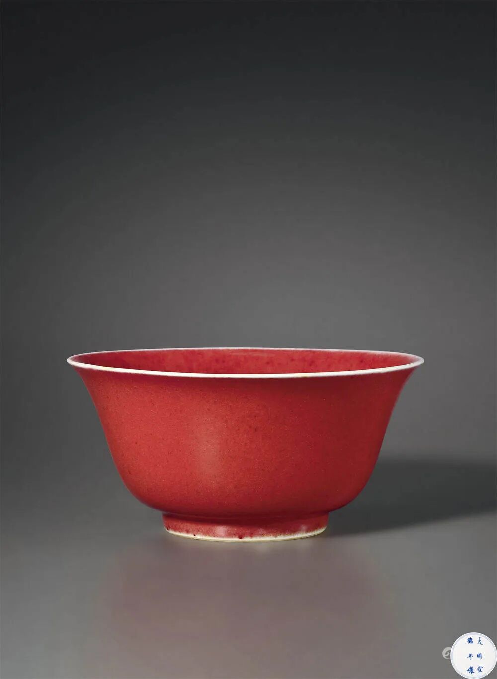 拍品估价:200,000 - 300,000 人民币1.纽约苏富比,1977年11月5日,编号213;传世康熙时期郎窑红器特征鲜明,如釉面肥厚光润,色彩鲜艳浓郁,胎骨洁白坚细,而足内多为米汤白釉,少见有花押款及刻款,如拍品造型、釉色均具有康熙时期郎窑红釉典型特征,而底部于青花双圈内落“大明宣德年制”楷书款者,更极为少见。且此款识书写有力,笔画顿挫,应为康熙早期书款方式,从侧面佐证后世所载“郎窑红”,并非康熙中晚期任督陶官之郎廷极所创烧之品,极富学术研究价值。
