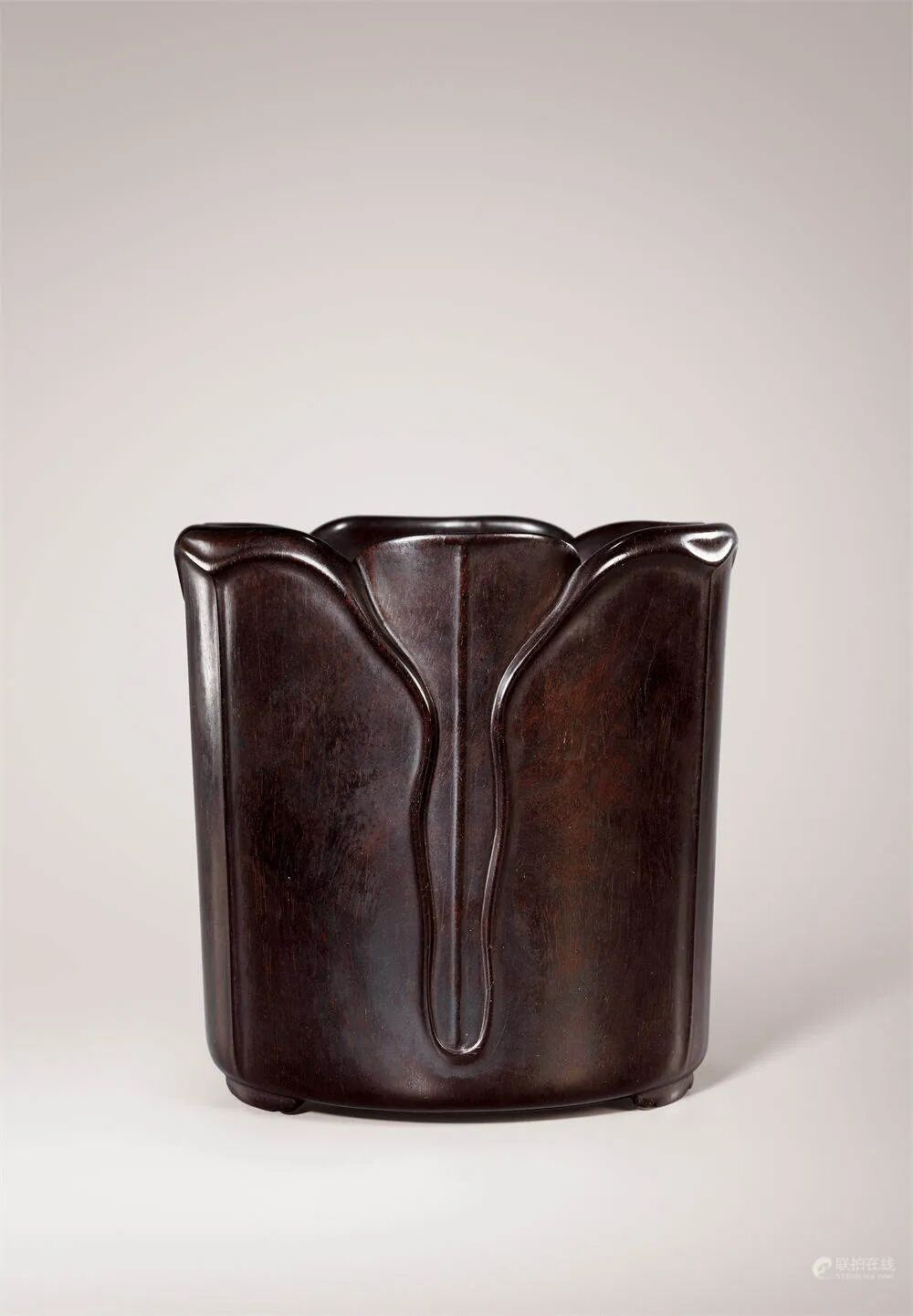 尺寸:Diam 15 cm ; H 15.1 cm拍品估价:350,000 - 450,000 人民币玉兰花自古即被视为清新高洁之象征,故文人常用以自勉,且玉兰含有“玉堂富贵”之意,明清文人尤喜以玉兰为咏绘对象,深得珍视。笔筒取紫檀整料掏挖制成,材质精良,木质坚致,纹理纤细浮,金星满密,变化无穷,包浆莹润,呈现出绸缎般光泽。整器呈圆筒状,直壁,口略撇,作玉兰花瓣形外翻,花瓣肥硕,造型生动,立体感强。口沿外圈沿花瓣之形起线,延长至筒身,刀法遒劲老道,线条婉转流畅,下设三足支撑。整器造型沉稳,质朴浑厚,简约典雅,工料俱佳,极具清初木刻风韵,为古代文人书房案头赏心悦目之佳作。