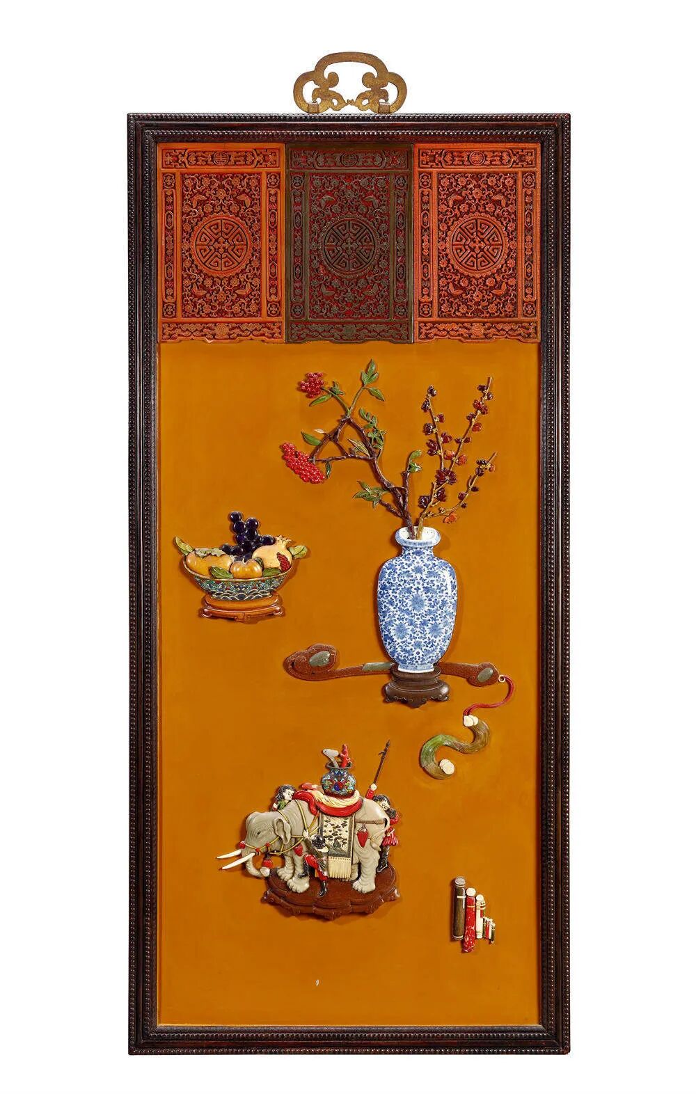 尺寸:121×52.8 cm(屏);129×60.6 cm(带框)拍品估价:550,000 - 800,000 人民币此件挂屏呈长方形,镶紫檀木为框,背髹黑漆,屏心髹赭黄色漆为地,顶部作双色剔彩漆雕挂签,仿清宫春节宫内所贴挂签,匠心独运,各式精美花纹拱卫中心描金“十字宝杵”,主题鲜明而突出。屏心使用淡赭黄色漆作为底色,推光极细,如瓷似玉,如同在老宣纸上作画,视觉效果颇佳。其上镶嵌百宝图案,选用材质丰富,以玉、寿山石、角、玛瑙、掐丝珐琅以及青花壁瓶镶嵌。挂屏中心位置镶嵌一清乾隆青花洋菊纹壁瓶,瓶中插两束花果,以鸡翅木为枝,以骨为枝叶,分别用蜜蜡、琥珀等装饰花果,壁瓶脚下放置一剔红嵌青玉如意。挂屏左侧放置一带木座掐丝珐琅碗,内盛各色瑞果。挂屏下方镶嵌一寿山石大象,其上驮掐丝珐琅瓶,三个小童在大象身侧戏耍,意寓太平有象。挂屏最下则为骨雕一组书卷。四组纹饰各有吉祥寓意,工艺精湛,极为写实,若置庭室,熠熠生辉,装饰性极强。拍品运用多种百宝镶嵌工艺于一身,尤其罕见的青花壁瓶镶嵌,观大体气势十足,窥细处妙趣横生,布局之绵密,构图之巧思,工艺之精绝,可视为清代宫廷工艺集大成之杰作,堪称清宫最高水准之代表。