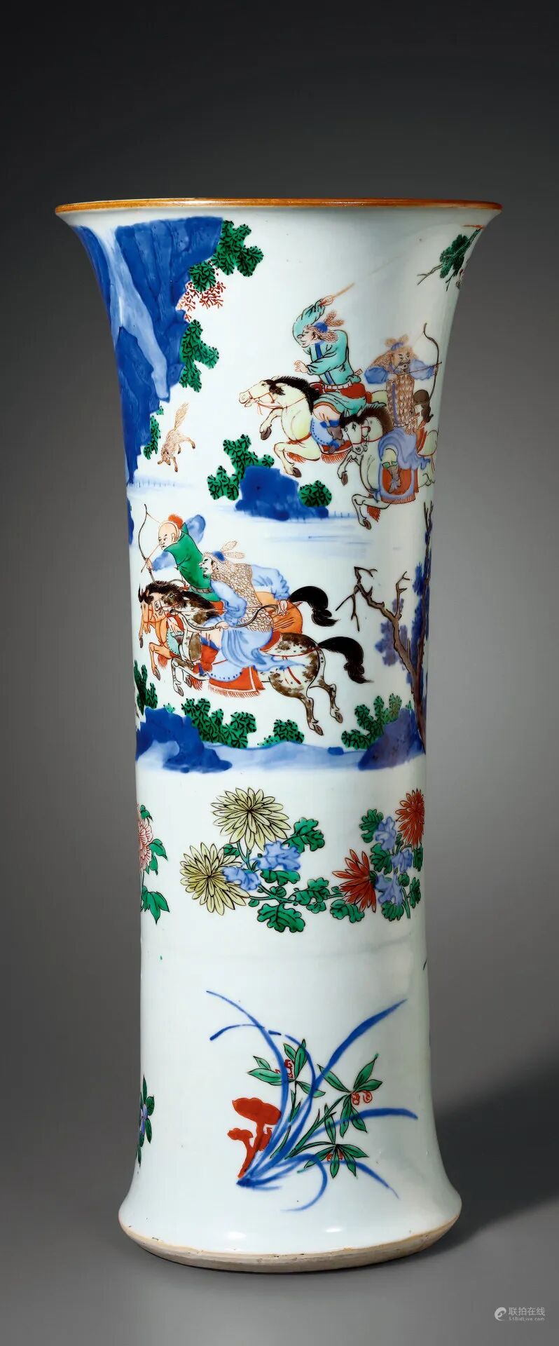 清康熙 青花五彩狩猎图花觚