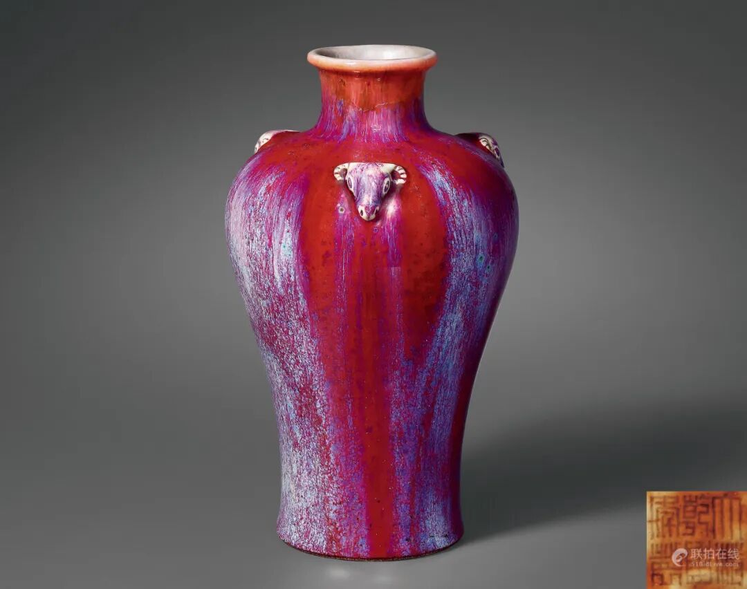 清乾隆 窑变釉三羊铺首梅瓶