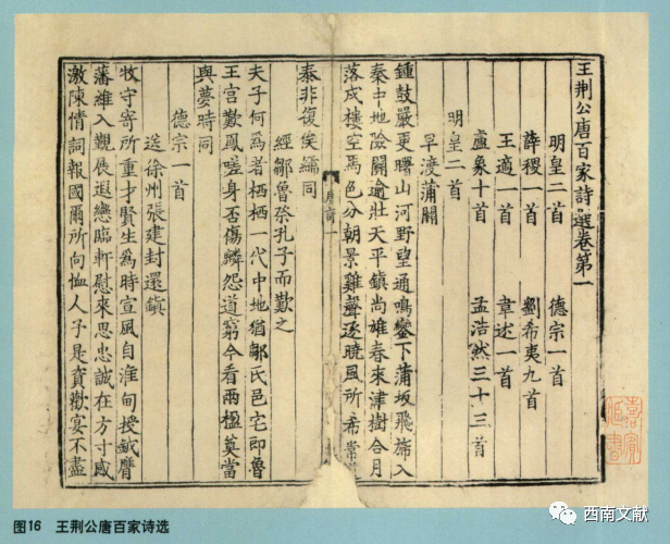北宋刻本今存者屈指可数,殊可宝贵。旧时有所谓北宋本者,经后人考订,复定为南宋本的例子很多。如吴县潘氏滂喜斋旧藏《王荆公唐百家诗选》(图16),叶昌炽所编之《滂喜斋藏书记》即定为北宋本,实际上该本之刻工大多为南宋前期江西地区的从业者,其中高智广、高智平、蔡侃为绍兴二十二年(1152年)抚州本《谢幼盘集》的刻工,高安国、高安道、高文显则在淳熙间(1174-1189年)为抚州公使库刻过《礼记》、《春秋公羊经传解诂》等书,故可推知此本为南宋绍兴淳熙间江西刻本。