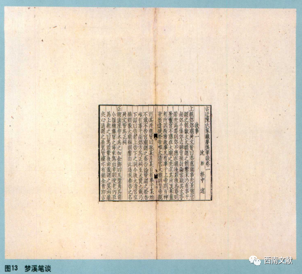 那么宋代为何大都采用蝴蝶装而不用线装呢?主要还是唯美的原因,追求与版面设计相统一的和谐之美。由于现存宋版大都经过改装,人们已很难领略原装之美,但如果借鉴一下中国国家图书馆所藏元刻本《梦溪笔谈》的蝴蝶式原装本(图13),你便会情不自禁地发出赞叹,这种大气美观,是其它装帧能替代的吗?也因为如此,清代如黄丕烈等收藏大家,才煞费苦心地把所藏宋版重改为蝴蝶装,但由于在千百年来的流传过程中,书本的边幅因磨损、重装而被数度切削,与原装开本面貌已不可同日而语,只能视为一种俊宋情感的凭借罢了。至于宋版因蝴蝶装而于版匡左外上方刻有书耳以便检览,蝴蝶装因边幅宽大、四周向外,从而具有保护书面不受损坏的实用功能等,在此就不展开讨论了。