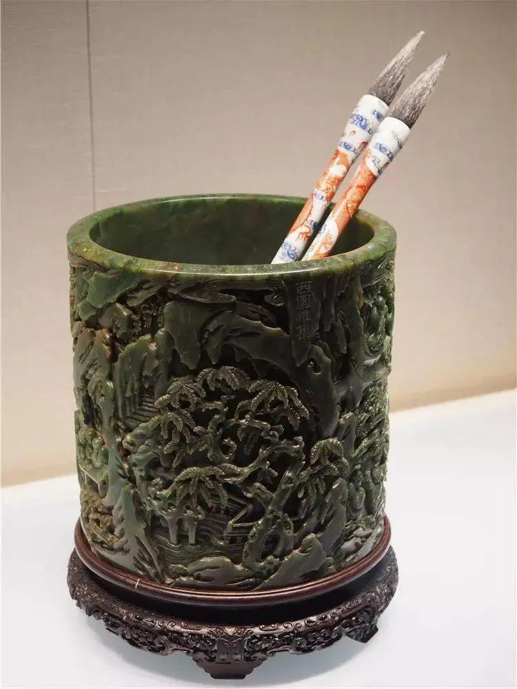 清乾隆 碧玉雕西园雅集笔筒