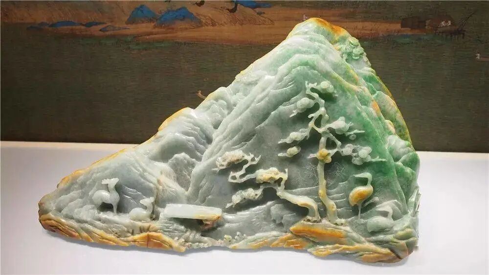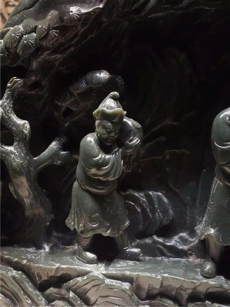 清 翠雕鹤鹿人物图山子