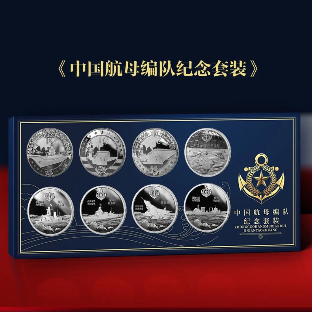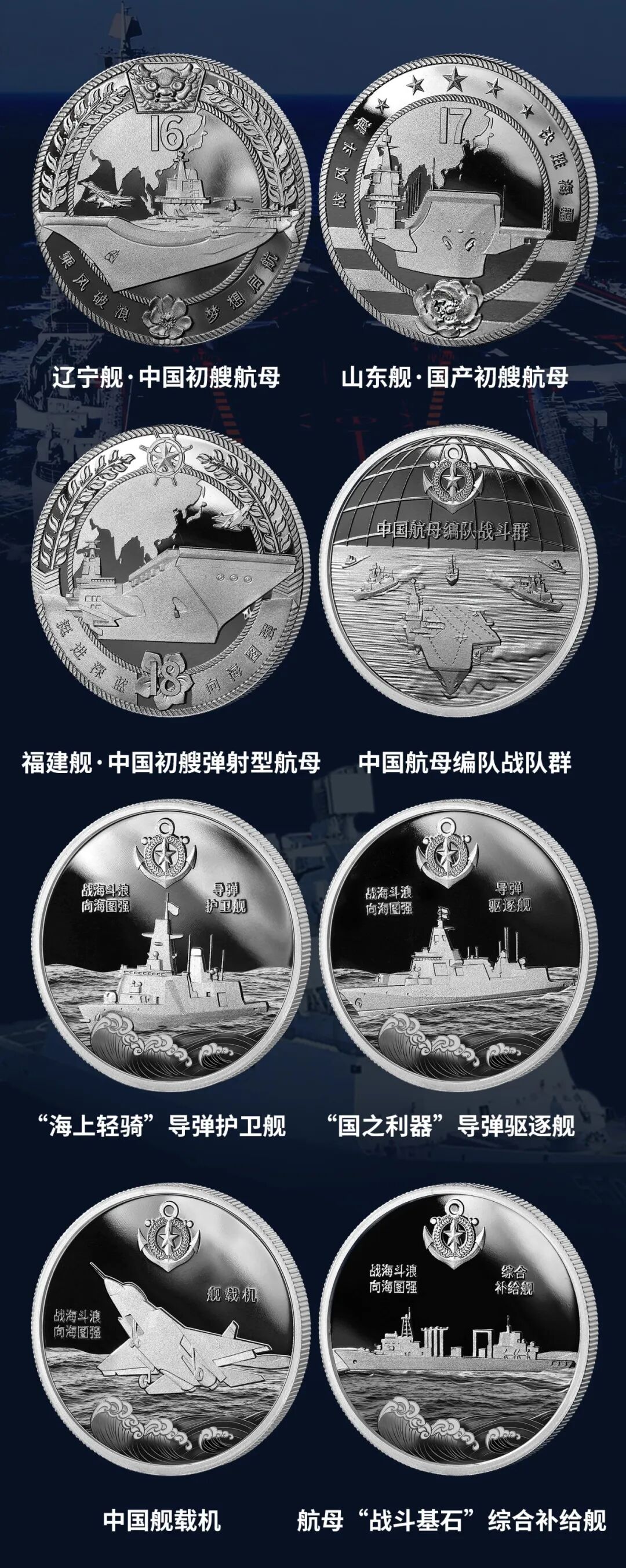 8枚章背面图案分别刻画了辽宁舰、山东舰、福建舰、中国航母编队战斗群、航母搭载舰载机配套编队(4枚)。![]()