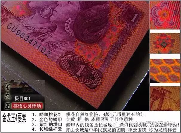 801金龙王币面桃花自然鲜红;鳞甲呈金黄色,又粗又鲜艳;垛口呈紫红色;背面的长城被祥云环绕着。