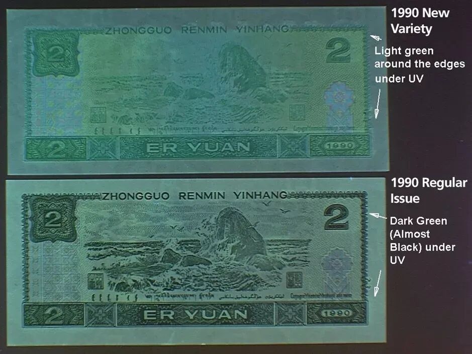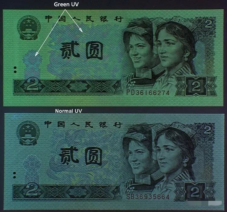 902绿幽灵是四版“荧光之王”,正面在紫外线灯光下呈绿色,普通版在紫外线灯光下颜色正常:(上图为绿幽灵,下图为普通902)