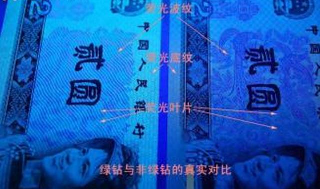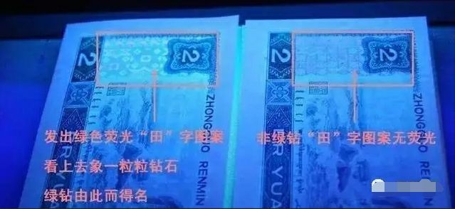 绿幽灵背面在紫外线灯光下边缘呈淡绿色,普通版别紫外线灯光下呈深绿色(几乎黑色):
