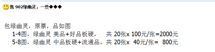 902绿幽灵市场价相当可观,美品单张价在100元左右,流通品价格稍低,在40元左右。