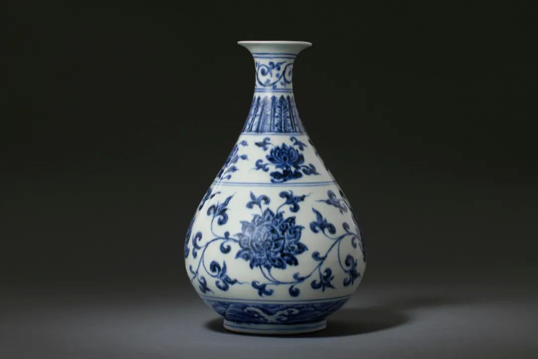 估价:港元 20,000,000 - 30,000,000香港佳士得,1995 年5 月1 日,拍品642 号;香港佳士得,2009 年12 月1 日,拍品1872 号鸿禧美术馆,台北,《清翫雅集收藏展》,1998 年,图录图版9 号H. Ling 及仇焱之,《抗希斋珍藏有明全代景德明瓷影谱下》,1950 年,16 号(图一);《中华文物集粹:清翫雅集收藏展》,台北,1995 年,图录图版118 号撇口,细颈,垂腹,圈足。通体绘五组青花纹饰,以双线相隔。颈饰卷草纹和蕉叶纹;肩饰折枝牡丹,月季,山茶和莲花; 腹绘四朵缠枝莲花,枝叶相缠;近足处绘浪涛纹。此器造型秀丽俊俏,发色鲜明,釉色莹润。