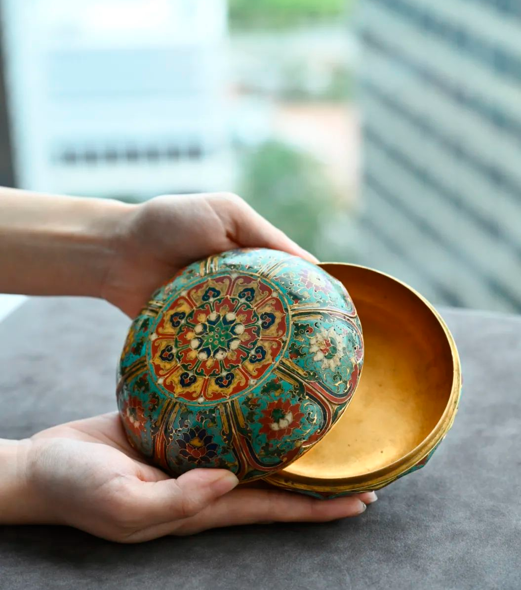 盒的莲瓣呈立体感,在制作胎体时需要特别的设计与打造,盒面莲心图案源于敦煌佛教壁画和画像砖的纹样,花叶使用二色或三色,是为了表现叶子的晕染效果,每朵莲花皆用三色珐瑯表现,亦是增加花朵的层次与饱满。碍于当时的制作技术,仔细观察盒表面有大小不一的砂眼,仿佛岁月的沧桑。无独有偶,台北故宫收藏一件几乎一模一样的同款盒,唯有刻款位置不同。