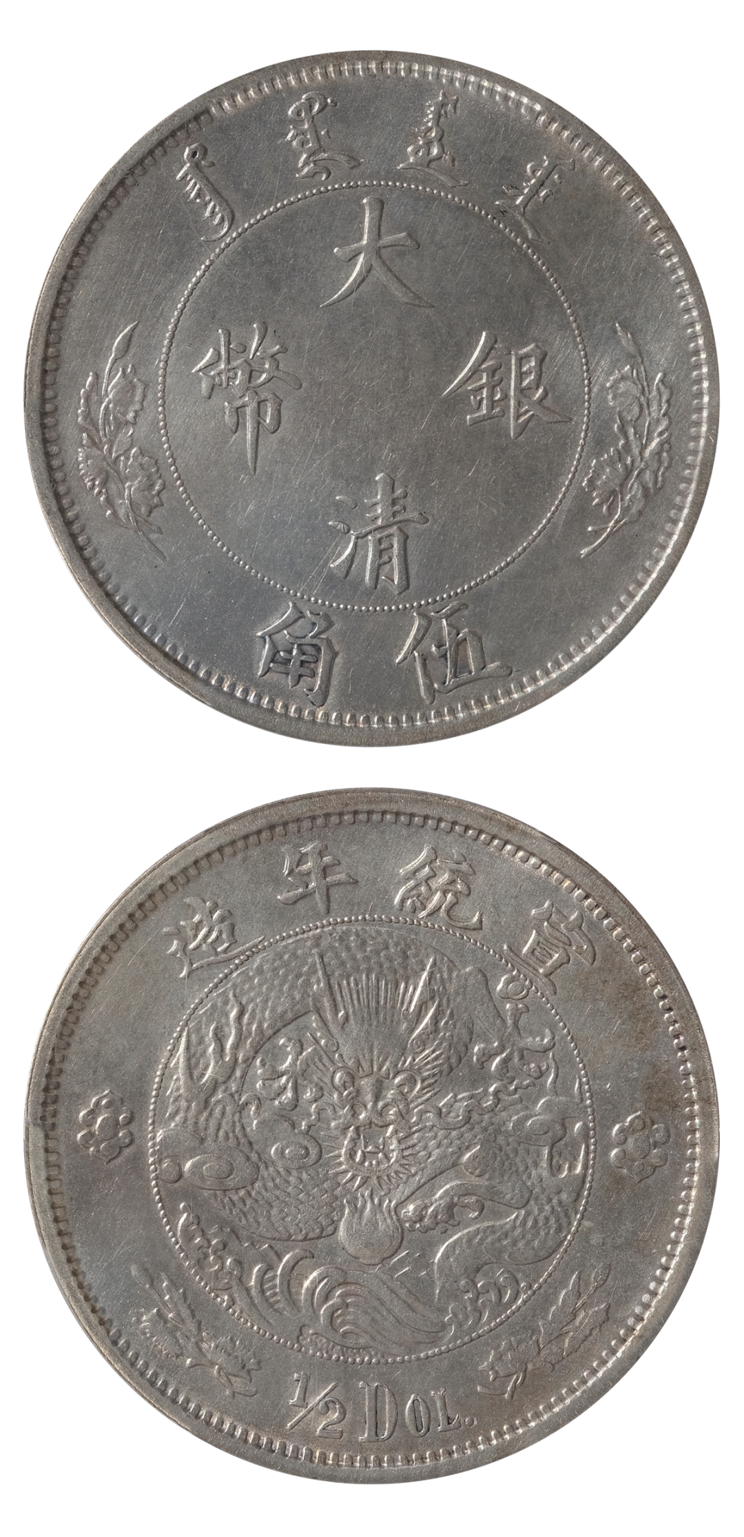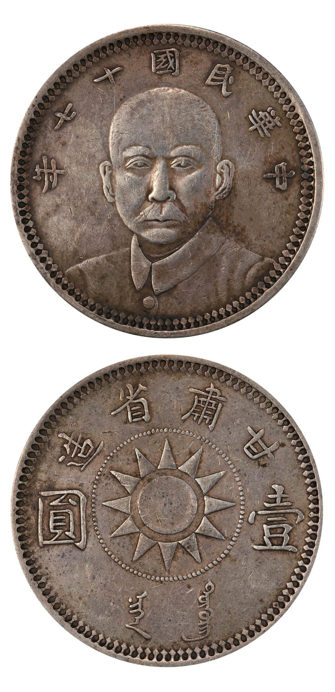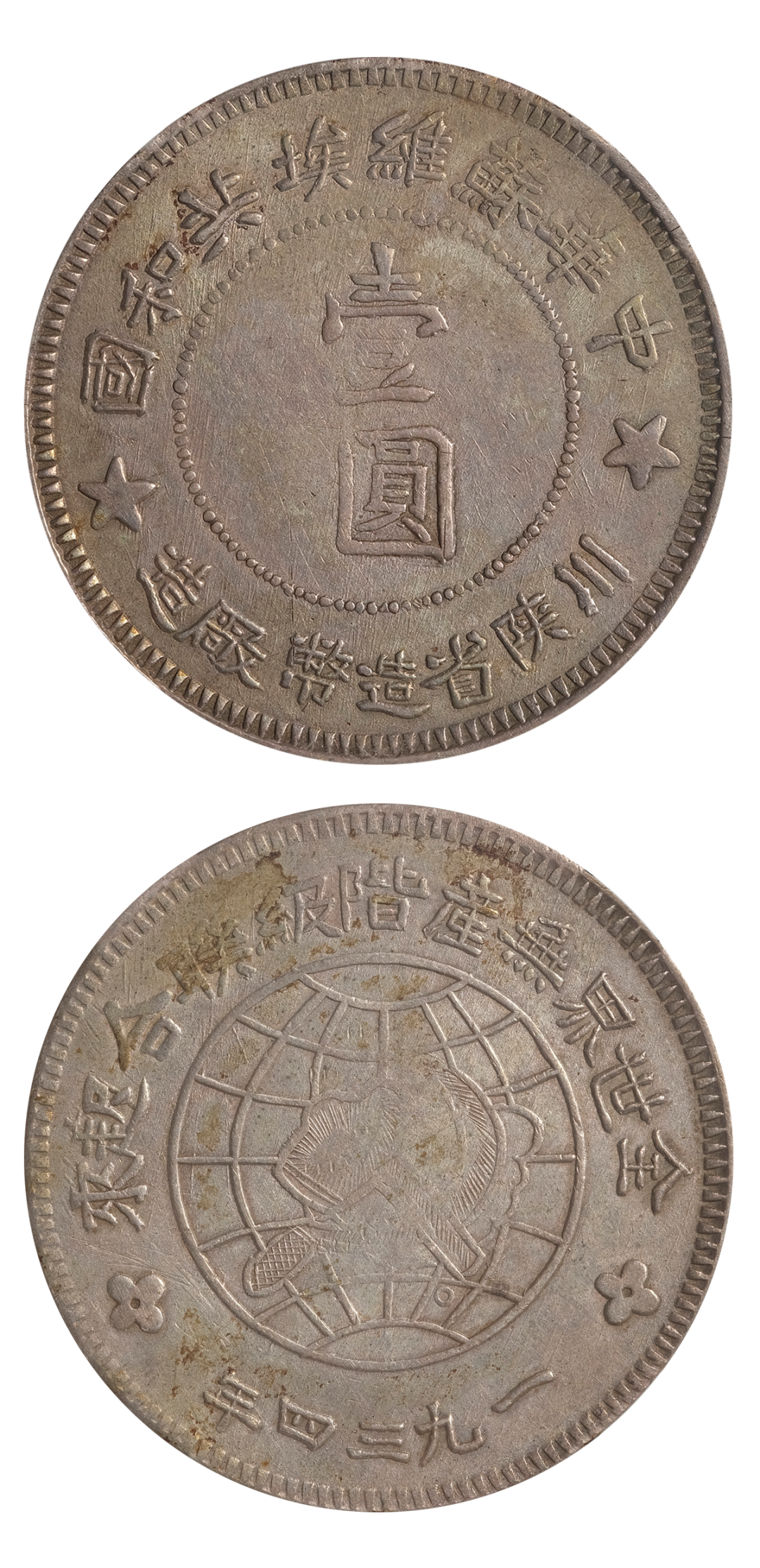 说明:银圆老藏家旧藏。杭州造币厂铸,该币正面主图为孙中山五分侧面像,背面主图为海洋三帆船。版别特征为正面孙像内耳廓呈垂直状,方领明显突出颈部,长形小字纪年币文。背面三帆船首尾各有一个阴文圆形舷窗。