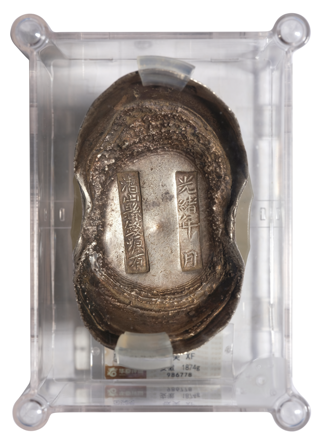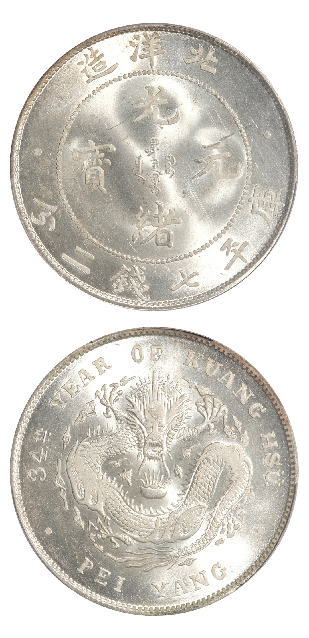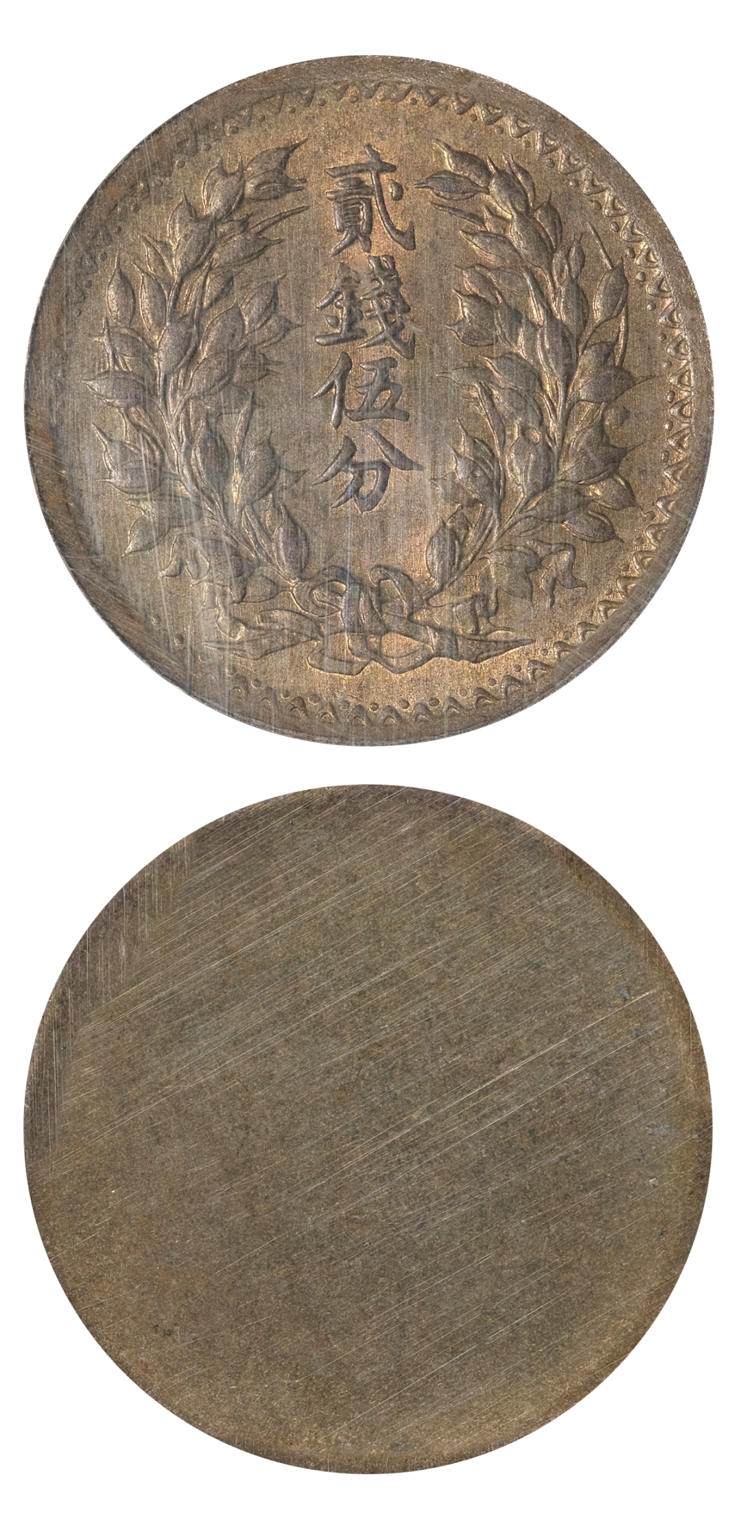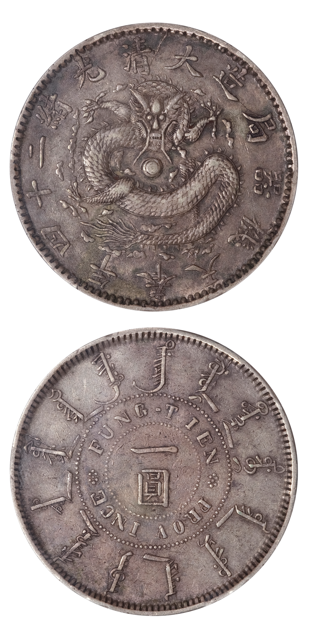 说明:银圆老藏家旧藏。杭州造币厂铸,该币正面主图为孙中山五分侧面像,背面主图为海洋三帆船。版别特征为正面孙像内耳廓呈垂直状,方领明显突出颈部,长形小字纪年币文。背面三帆船首尾各有一个阴文圆形舷窗。
