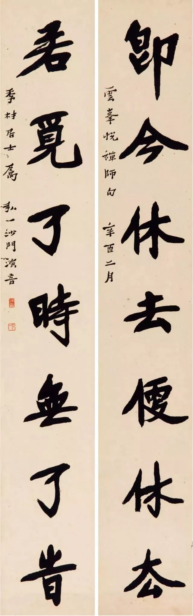 弘一大师的书法常以对联形式出现,内容取自佛教经典。字与字之间隔得较远,大概有三分之二个字的距离,给人疏落空阔之感,一个字是一个字,文质彬彬,很好地体现出“计白当黑”的美感效应。