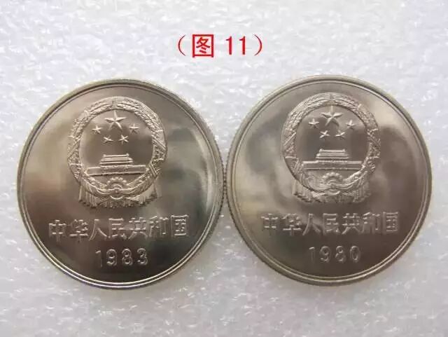 1983年壹圆长城币由上海造币厂生产。币的背面长城图案上方的凹入部分,也有国徽透打形成的彩虹状痕迹,背面凹入部分的片状铸造纹理较轻,无镜面效果,币的特征与1980年有砖版基本一致。