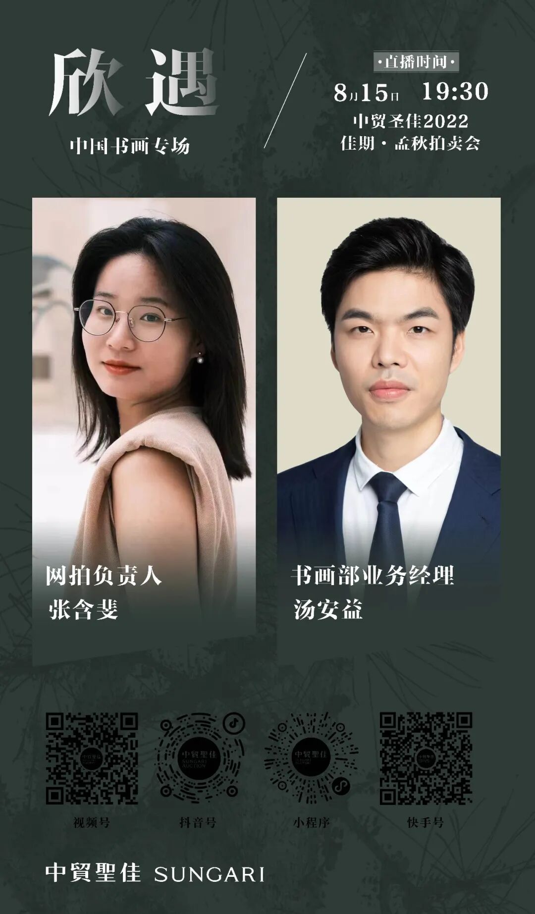 本期“欣遇——中国书画专场”中还准备了直播讲解,由中贸圣佳网拍负责人张含斐、中贸圣佳书画部业务经理汤安益,为您解说本期专场中的精彩拍品,欢迎您关注中贸圣佳官方直播间,精彩来袭,不容错过!