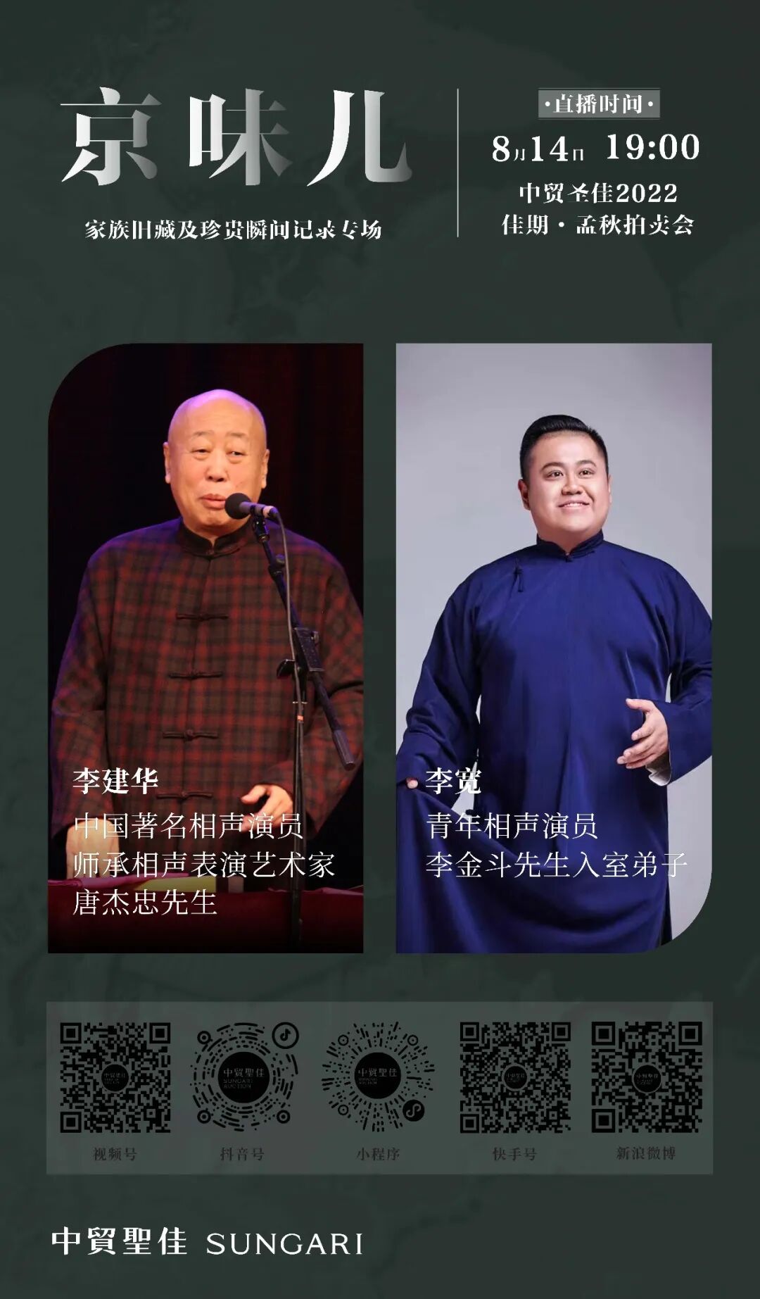 8月14日,由著名青年相声演员、李金斗老师的入室弟子李宽先生,与中国著名相声演员、师承相声表演艺术家唐忠杰先生的李建华先生,一起带来“京味儿—家族旧藏及珍贵瞬间记录专场”直播讲座,与您一起聊聊专场中的精彩拍品,扫描下方二维码,锁定中贸圣佳直播间,精彩即将开启,敬请期待!