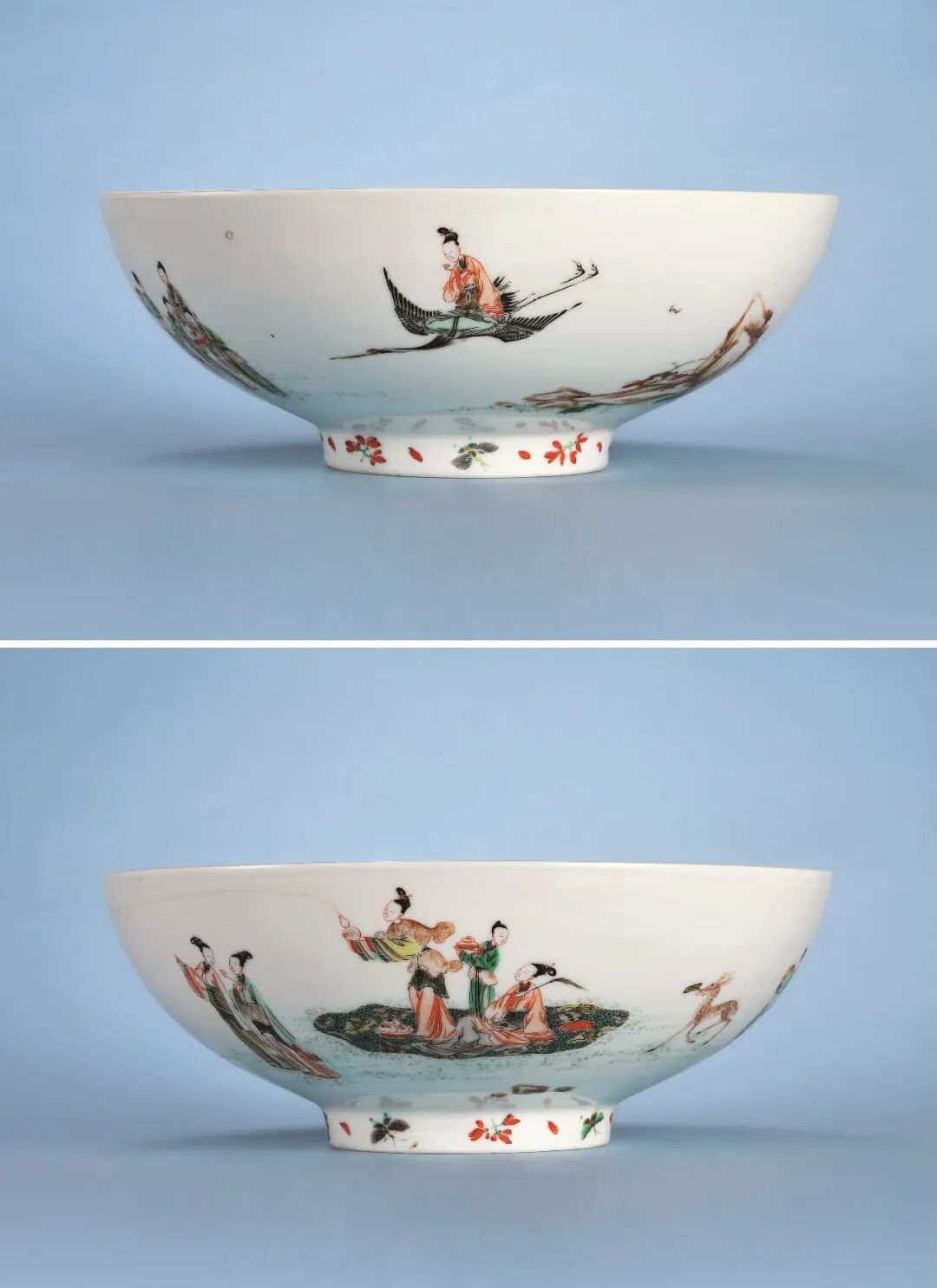 梁晓新先生认为,磁臻第五期拍卖中出现的这件康熙五彩描金西王母瑶池赴宴图大碗极为珍希,是康熙寿文化官窑瓷器上特别突出的一个题材体系。