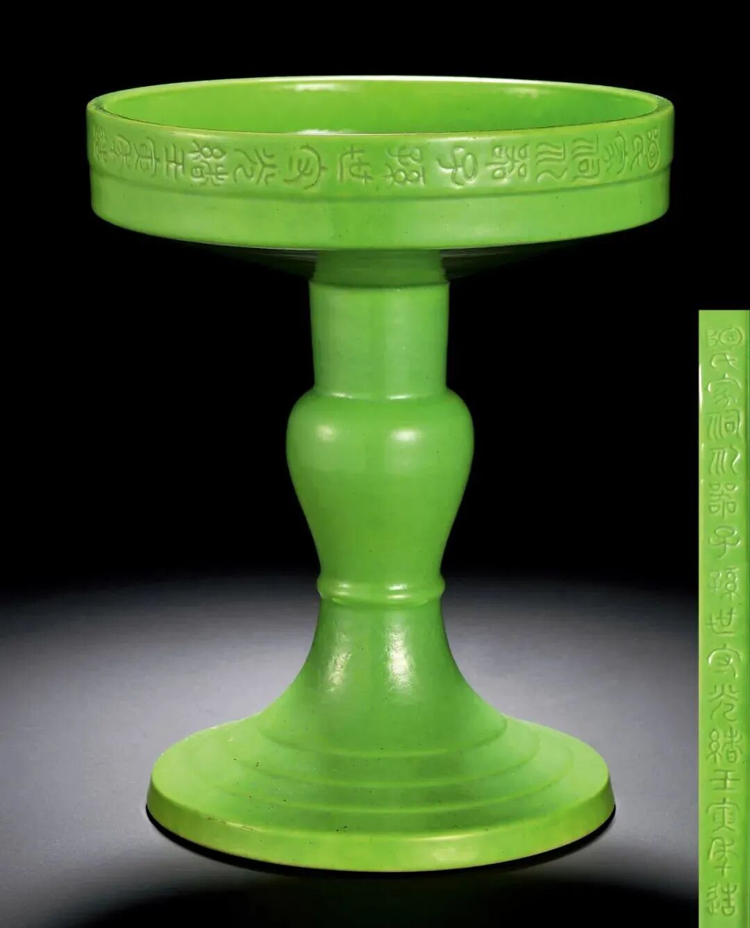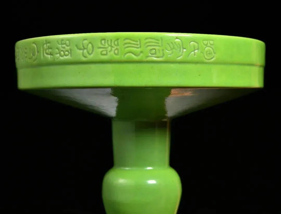 端方手握大权,即便在景德镇御窑厂内想必也是有话语权的,加之他对青铜器和官窑瓷器都有着广泛接触和自己的深刻理解,于是细看这件端方定制的秋葵绿豆形镫便可知为何精工如斯了。此作发色极好,因整器胎骨精良细密,施釉均匀莹润,故釉色绿中带黄,淡雅宜人,是光绪单色釉官窑上乘之作。而所铭篆书字体充实厚转,提按起倒,富于变化,线条圆涩厚重,无纤曼之气,质而不滞,在秋葵绿釉的映衬下既具古之雅意又清新有加。