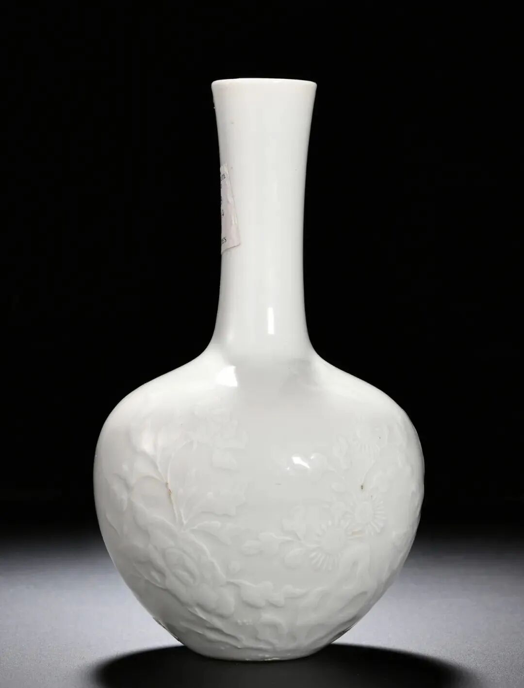 清雍正 白釉模印洞石花蝶纹长颈撇口小瓶