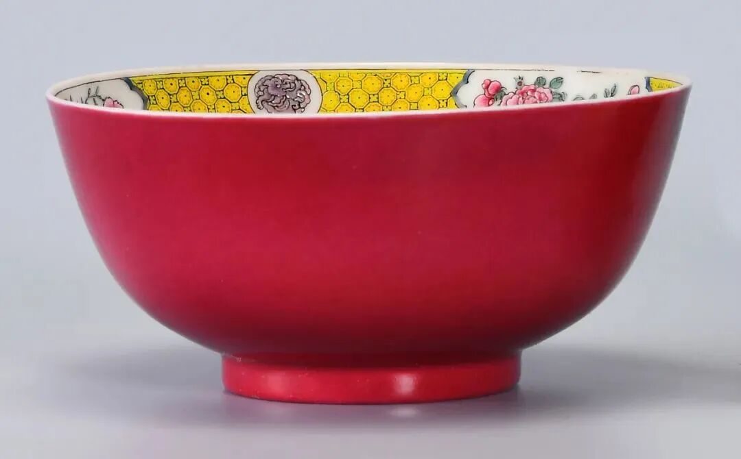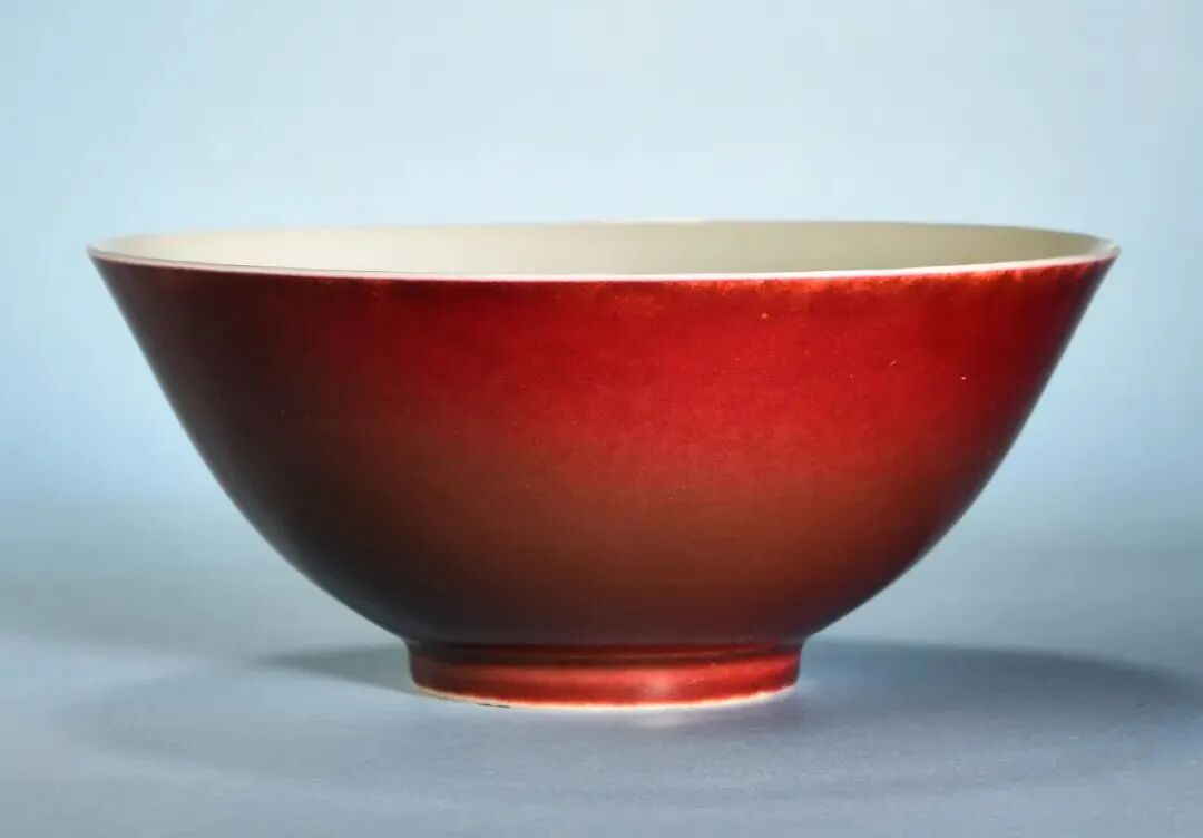 “正色”之红在明代象征了等级地位,至清朝时此用色限制大有放松,不为皇家、官家所强力行政垄断,因此社会各阶层在可以获取后便趋之若鹜。这只郎窑红釉碗便是那时高官、文豪们极为追捧之器。此郎窑红仿效的是明代宝石红,为明代的皇家正色之器。如高士奇曾作《成窑鸡缸歌》,内中的“宝碗鸡缸盘积红,市中论价称奇货”一句指的便是成化鸡缸杯和永乐、宣德所谓的“鲜红宝烧”碗。而其诗中又言及的“血色朱盘日轮射”,指的也是康熙朝的牛血红瓷器,亦即通常所说的郎窑红釉作品。