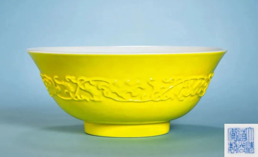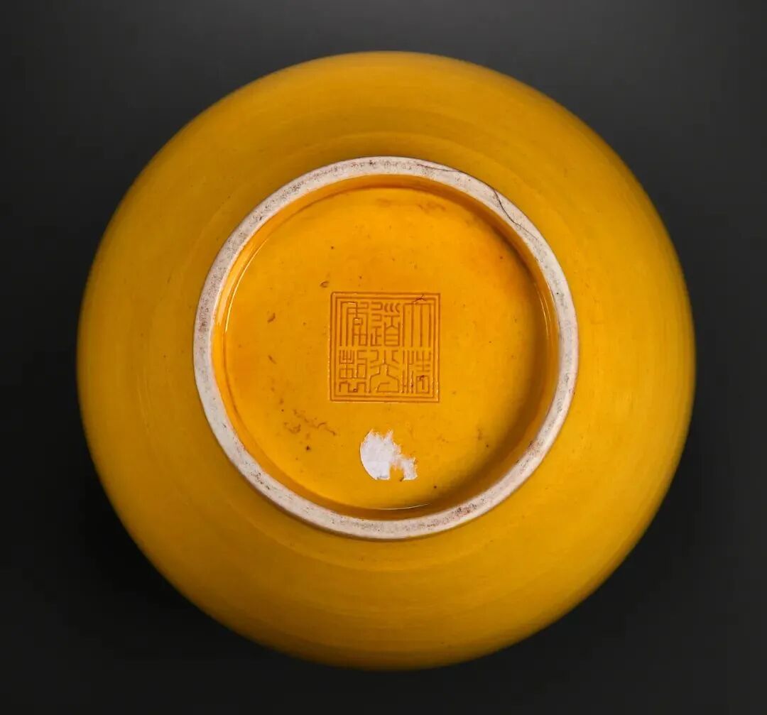 本品为道光时烧造,这时雍正瓷器的宁谧素雅美学得到了某种程度的隔代继承(乾嘉瓷器多有繁缛之作),此碗便是一例。雍正时创烧的柠檬黄釉御器呈色淡雅,于此器上神韵再现。黄釉外壁模印花卉更具立体感,碗心寿桃纹亦清逸简约,岁月静好由此可感。