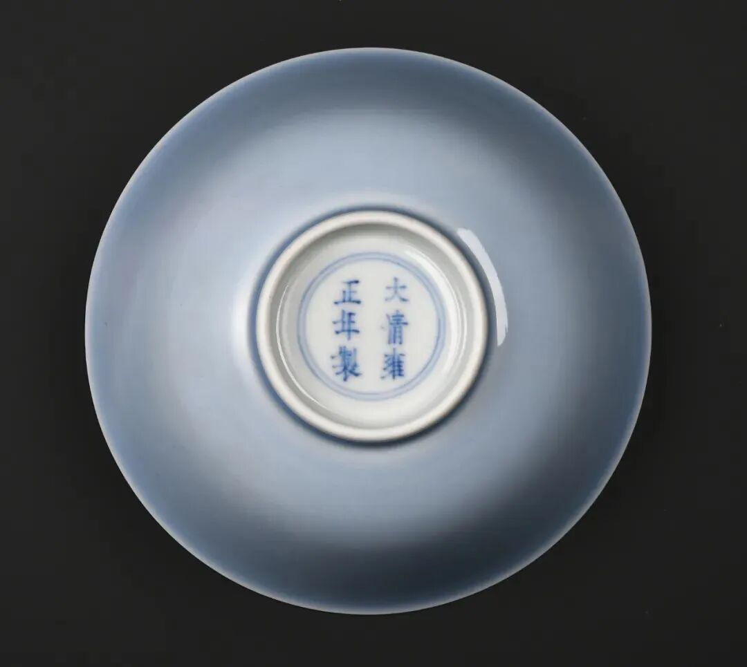 天蓝釉是氧化钴含量1%以下的高温釉,色调似天空之蔚蓝色,故称“天蓝釉”。雍正时期天蓝釉有深浅两种,深者如雨后晴空,浅如月白。这只清雍正天蓝釉本品通体所罩天蓝釉便近似月白,其釉质莹润,釉色淡雅悦目,色泽柔和,更显整体轻巧俊秀,有晴空疏朗之美,所倡导的美学观念与雍正政坛主清廉修身、需寡欲勤政的做派相一致。